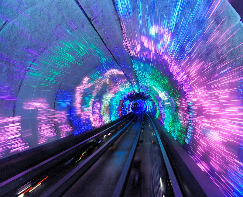 푸동지역과 푸서지역을잇는 와이탄 관광터널은 지하철이라기 보다는 단거리 이동수단에 가깝다. 646.7미터의 터널 내벽에 갖가지 색깔의 레이저와 조명, 음악 특수효과를 사용해 환상적인 분위기를 연출한다. 마치 놀이공원에서 놀이 기구를 타는 것처럼 터널을 지나가는 동안 조명과 레이저쇼를 볼 수 있다. 와이탄 관광터널 영상 Shanghai sightseeing tunnel.