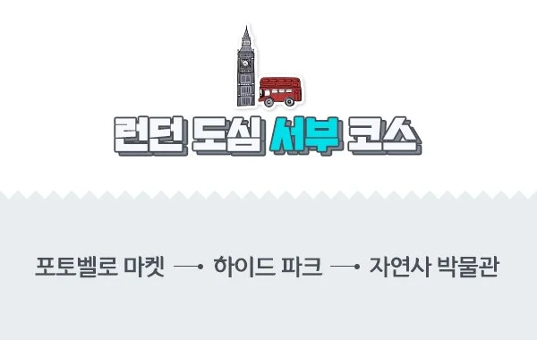 런던 도심 서부 코스의 경우, 포토벨로 마켓 - 하이드 파크 - 자연사 박물관으로 이어진다. 이 일정은 토요일에 진행했을 때, 가장 알찬 여행이 될 수 있다. 왜냐하면, 런던의 4대 마켓 중 한 곳인 포토벨로 마켓의 일반 상점, 옷 상점, 앤티크 상점이 모두 함께 열리는 요일은 토요일밖에 없기 때문이다. 또한, 이외에 포토벨로 마켓을 가야 하는 또 다른 이유는 세계적인 로맨틱 영화의 배경인 노팅힐 서점이 있기 때문이다.