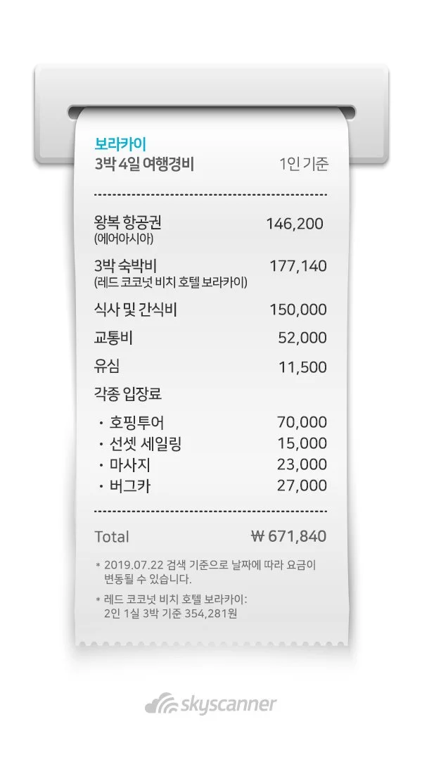 누구나 여행을 꿈꾸는 세계 3대 휴양지 보라카이! 6개월간의 정비를 마치고 작년 10월에 재개장하여 더욱 아름답고 깨끗한 모습으로 우리를 기다리고 있다. 신나게 해양 액티비티를 즐길 수 있는 깨끗한 바다와 때 묻지 않은 자연의 절경, 모든 피로를 씻어가는 마사지까지 모든 것이 우리의 몸과 마음을 힐링시켜줄 것이다. 스카이스캐너가 소개하는 일정과 경비로 3박 4일 보라카이 자유여행을 떠나보자.