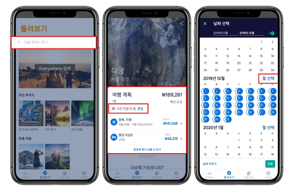 저렴한 다낭 항공권을 찾는다면 스카이스캐너 앱을 이용해보자. 우선 앱에 접속한 뒤, 탐색 탭의 목적지 창에 '다낭'을 검색하면 최저가 항공권을 확인할 수 있다. 여기서 [모든 시간(편집)]을 탭하고 내가 원하는 특정 달을 골라 [이달 전체 선택]을 탭하자. 이를 통해 해당 월의 가장 저렴한 항공권을 확인할 수 있다.