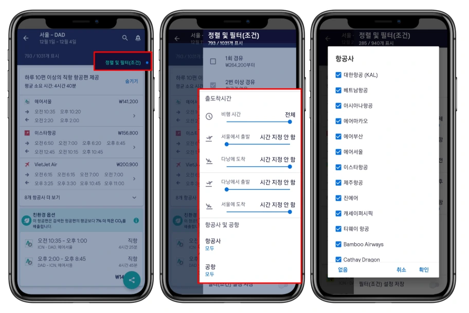 또한, 일정을 정하고 항공권을 검색했다면 검색 결과 우측 상단의 [필터(조건)]을 탭해보자. 항공사/경유/비행시간 등을 선택할 수 있다. 인기 여행지인 만큼 다낭 항공편은 항공사와 시간대 선택의 폭이 매우 넓으니, 이를 고려하여 원하는 조건에 맞게 항공권 검색 결과를 필터링해보자.