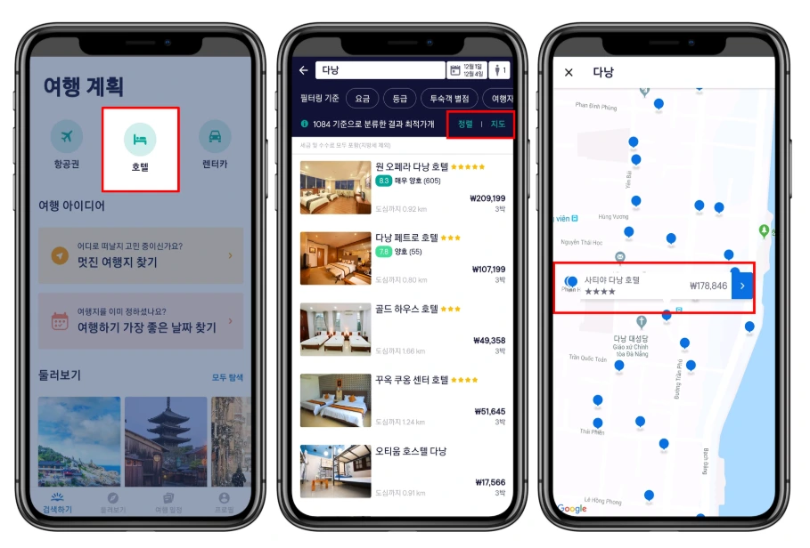 다낭 여행을 위한 항공권뿐만 아니라 숙소 검색 역시 스카이스캐너와 함께하자. 앱에 접속한 뒤 [호텔]을 탭하고 목적지에 다낭을 검색한다. 그 뒤 우측 상단의 [지도]를 클릭하면 지도를 통해 모든 호텔의 위치를 확인할 수 있다. 이 중 한 곳을 탭하면 호텔의 이름과 가격, 등급을 한눈에 확인하고 예약할 수 있다.
