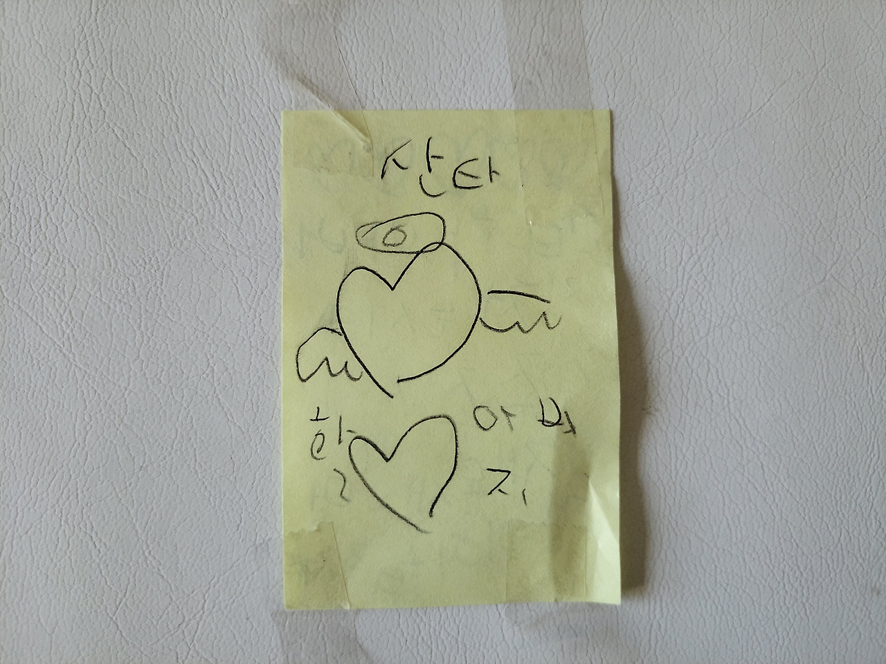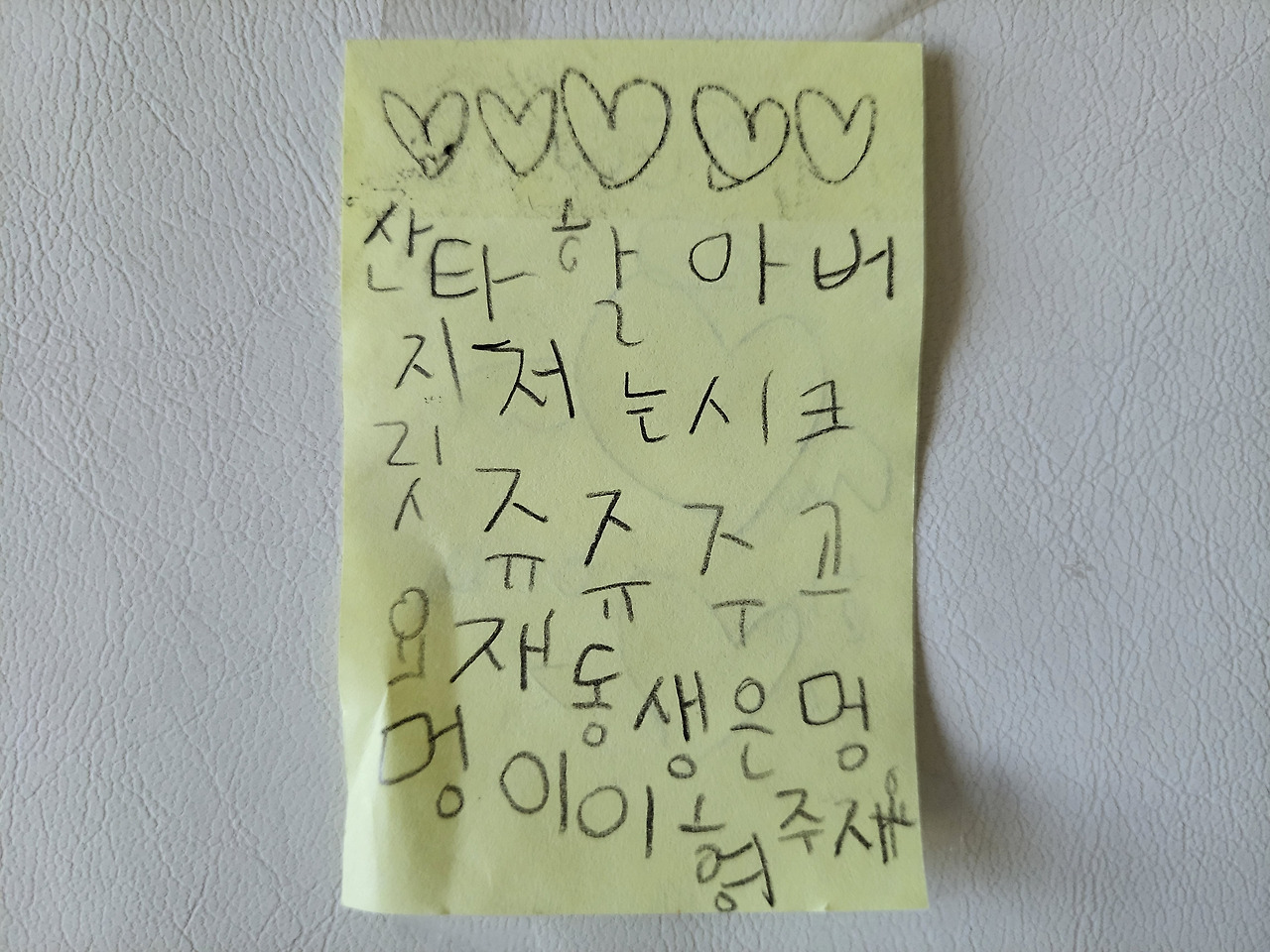 아이는 곧바로 산타할아버지가 보시게 메모지에 편지를 써서 베란다 창문에 붙여놓았다. 동생의 선물을