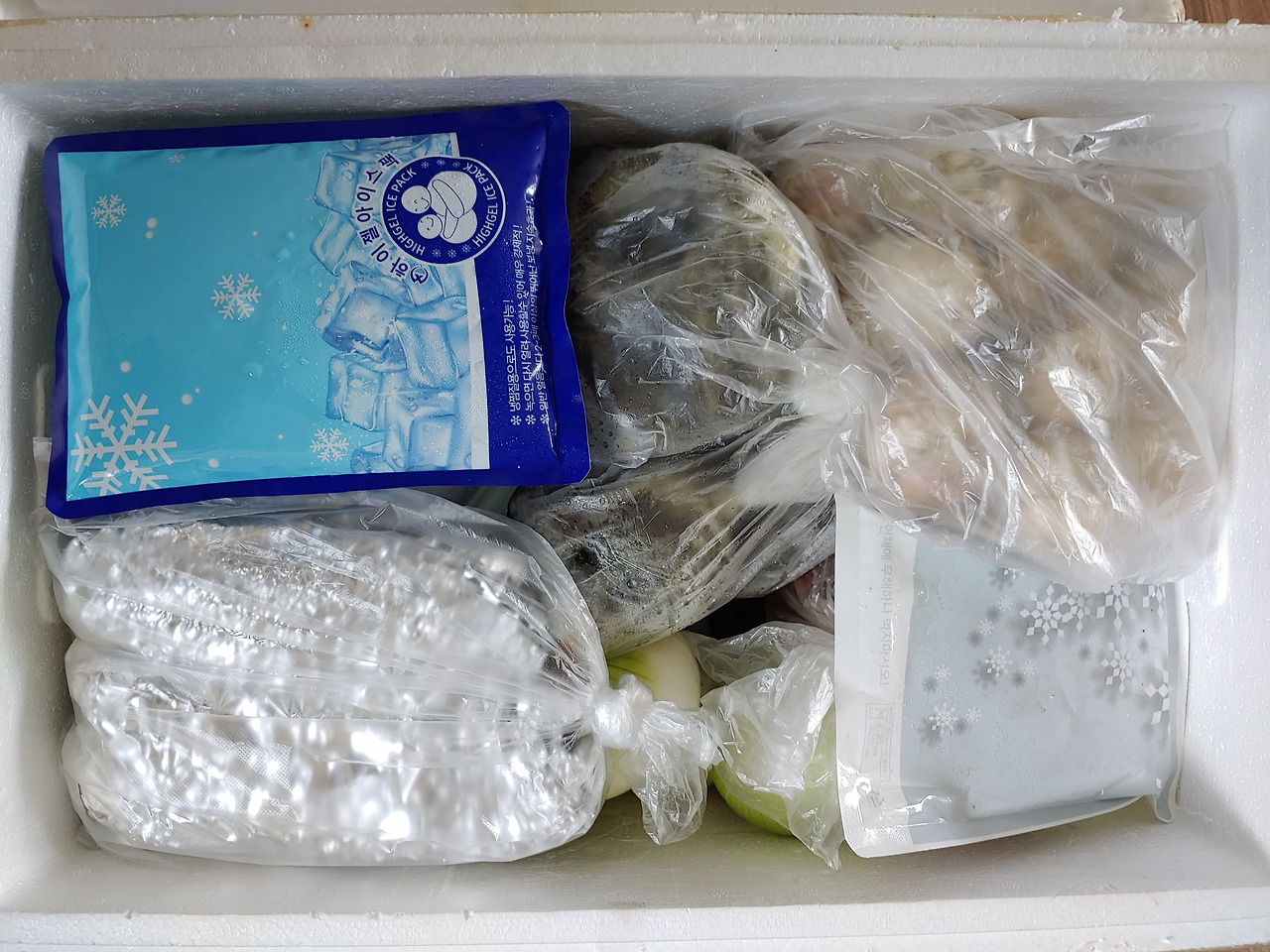 각종 김치류와 불낙전골, 전복장조림, 구운 생선, 찜닭, 밑반찬, 미역국, 직접 기르신 양파와 마늘이 들어있다. 반찬을 하나씩 정리하다 보면 부엌에 서계신 엄마의 뒷모습이 보인다.