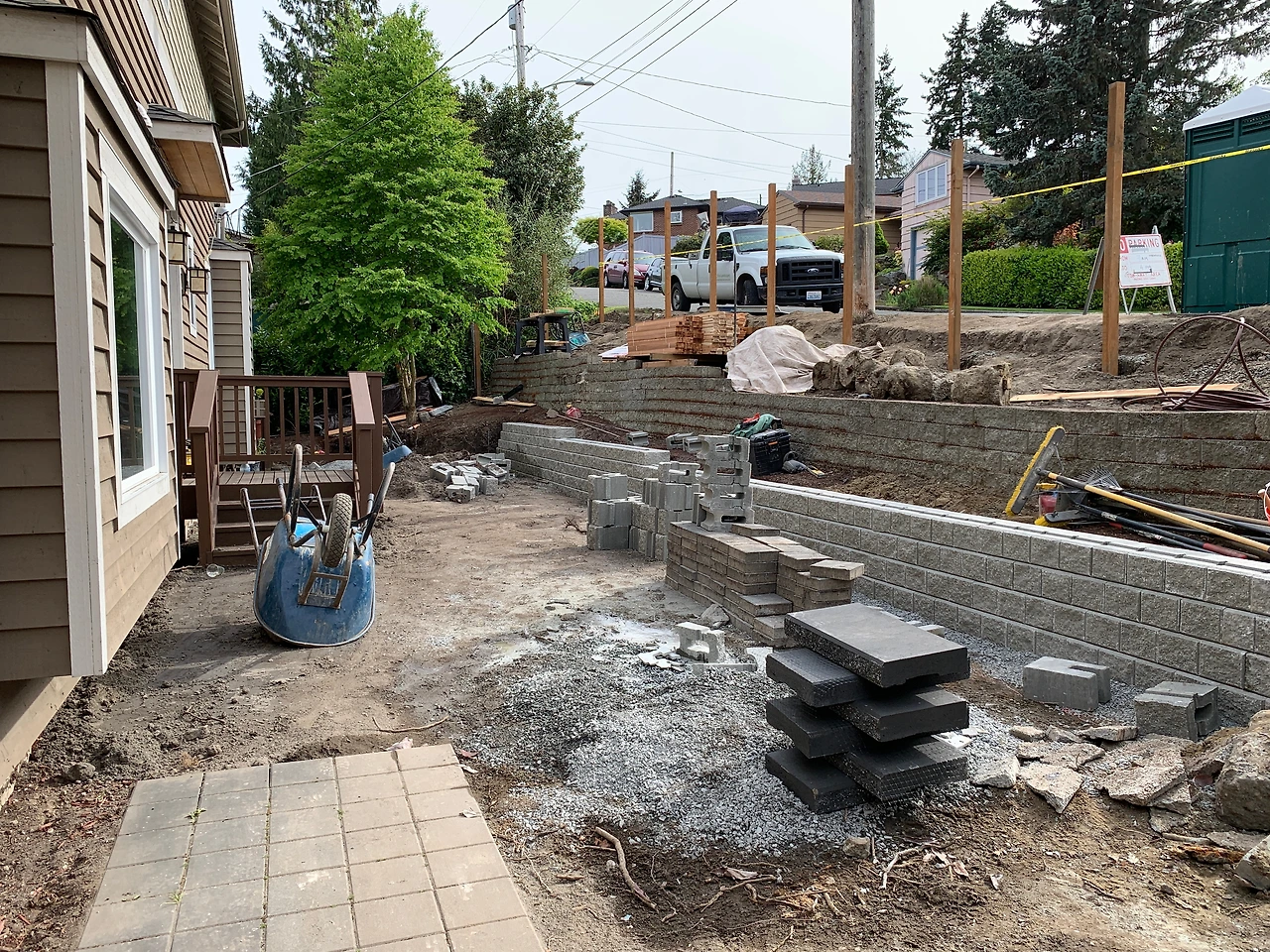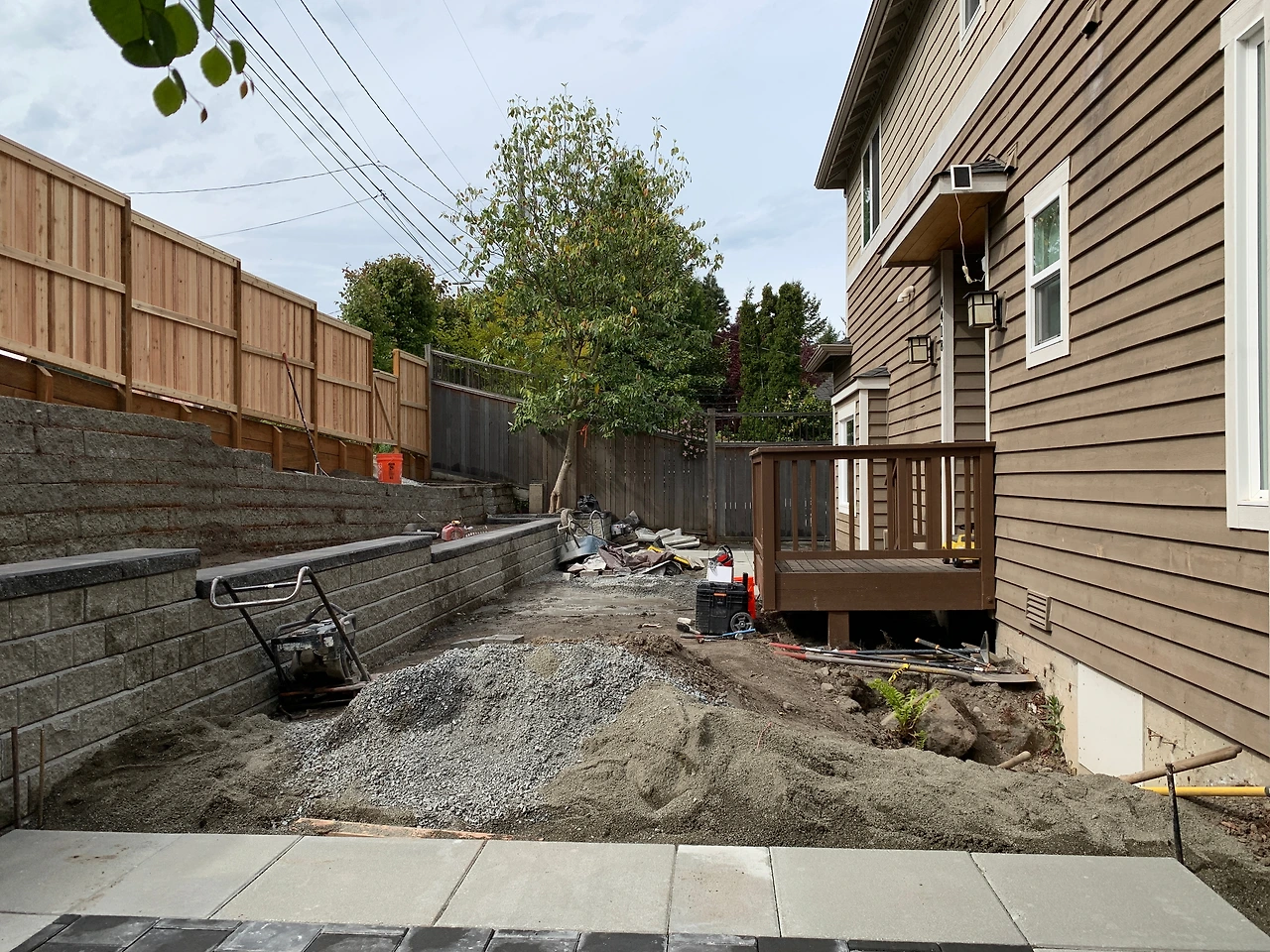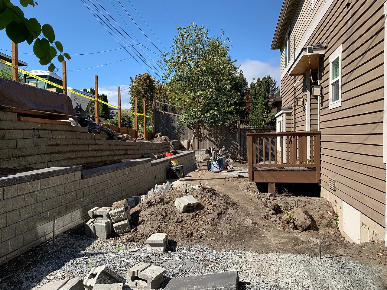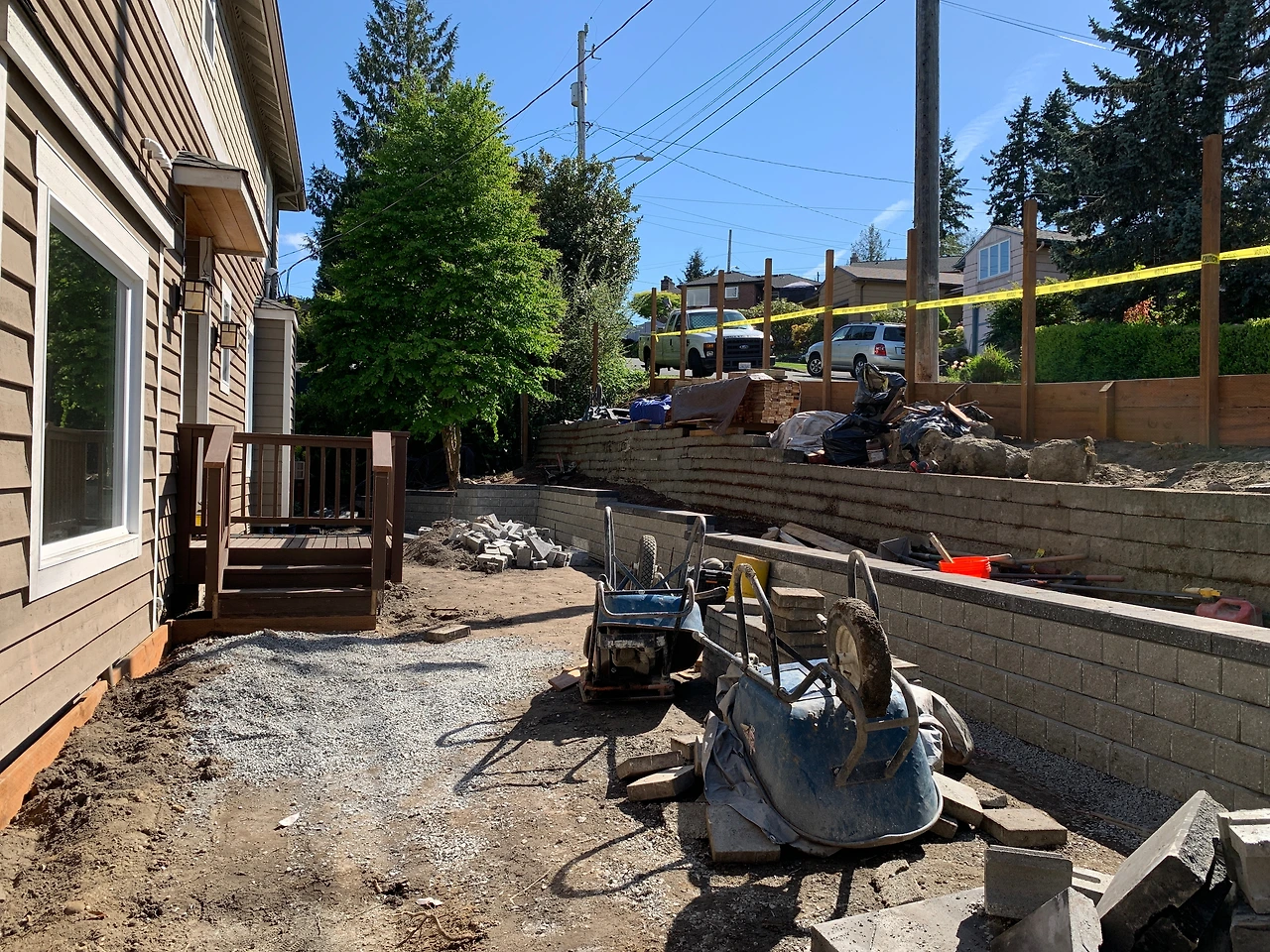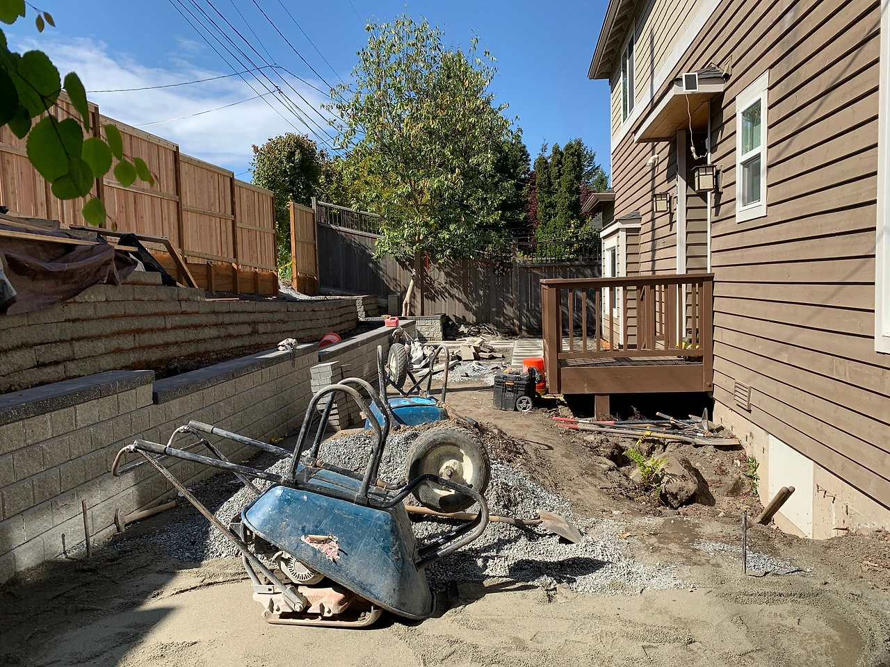 공사가 시작되기 전. 붉은 색 돌과 관리되지 않은 잡초들, 그리고 하나 같이 관리하기 어려운 나무들만 가득하다. 1주차 첫째날. 붉은 벽돌을 모두 제거하고 나무들을 잘랐다. 1주차 둘째날. 나무들과 돌들이 모두 없어졌다. 1주차 셋째날. 앞쪽 벽 설치를 위해서 흙이 제거되었다. 이로써 더 넓은 공간을 얻게 되었다. 1주차 넷째날. 입구쪽 땅 평탄화가 진행되면서 흙이 더 제거되었다. 1주차 다섯째날. 벽 설치를 위해서 땅을 파고 돌이 깔렸다. 2주차 첫째날. 앞쪽 벽이 조금씩 설치가 되고 울타리가 허물어졌다. 2주차 둘째날. 앞쪽 벽이 좀 더 모양을 갖추었고 새 울타리 설치를 위한 기둥이 세워졌다. 2주차 셋째날. 앞쪽 벽이 거의 완성이 되었다. 2주차 넷째날. 울타리 바깥 흙을 지탱할 버팀목과 입구쪽 나무 밑에 벽이 설치되고 현관 계단이 조정되었다. 2주차 다섯째날. 모든 벽이 완성되고 울타리 2차 버팀목이 설치되고 현관쪽 돌이 모두 제거되었다. 3주차 첫째날. 울타리 틀이 완성되고 평탄화 및 지대를 조금 높이기 위해서 흙이 추가되었다. 3주차 둘째날. 입구와 현관을 연결하는 블럭이 설치되고 울타리가 완성되었다. 3주차 셋째날. 파티오쪽 블럭이 설치되고 울타리 문이 설치되었다. 3주차 넷째날. 불필요한 흙들과 자재들이 정리되고 1차적으로 식물들이 심겼다. 또한 지하로 향하는 부분이 정리되었다. 3주차 다섯째날. 잔디가 깔리고 모든 식물들이 자리를 잡았다. 바깥은 지저분한 돌과 관리되지 않는 잡초로 가득했는데 잔디로 대체됐다. 위와 같이 공사과 완료된 후 며칠이 지난 뒤 입구 쪽 계단이 완성되고 그 뒤 몇 주가 지난 후에 입구 쪽 계단에 손잡이가 설치되면서 모든 공사가 완료되었다.