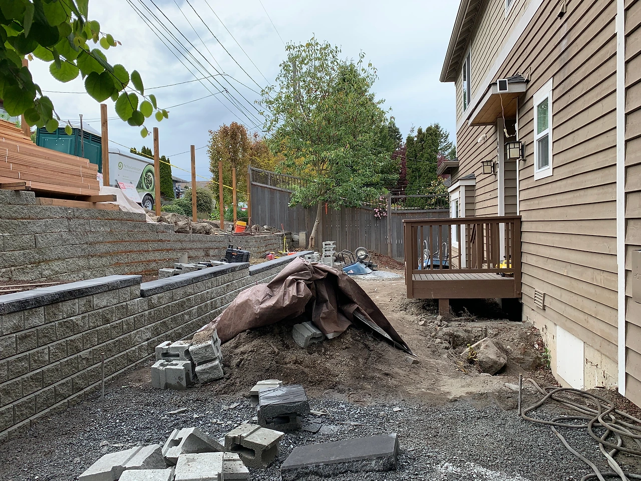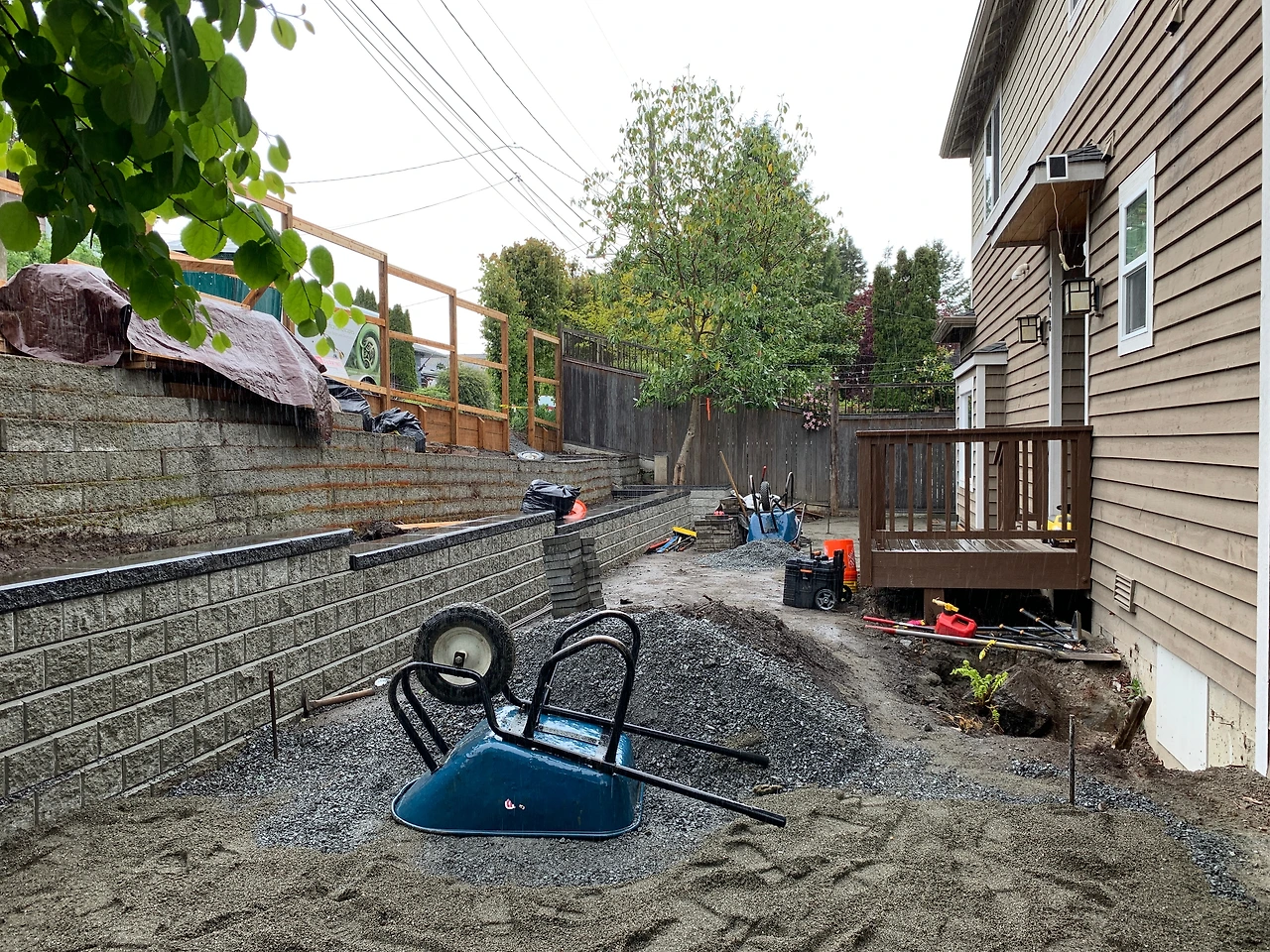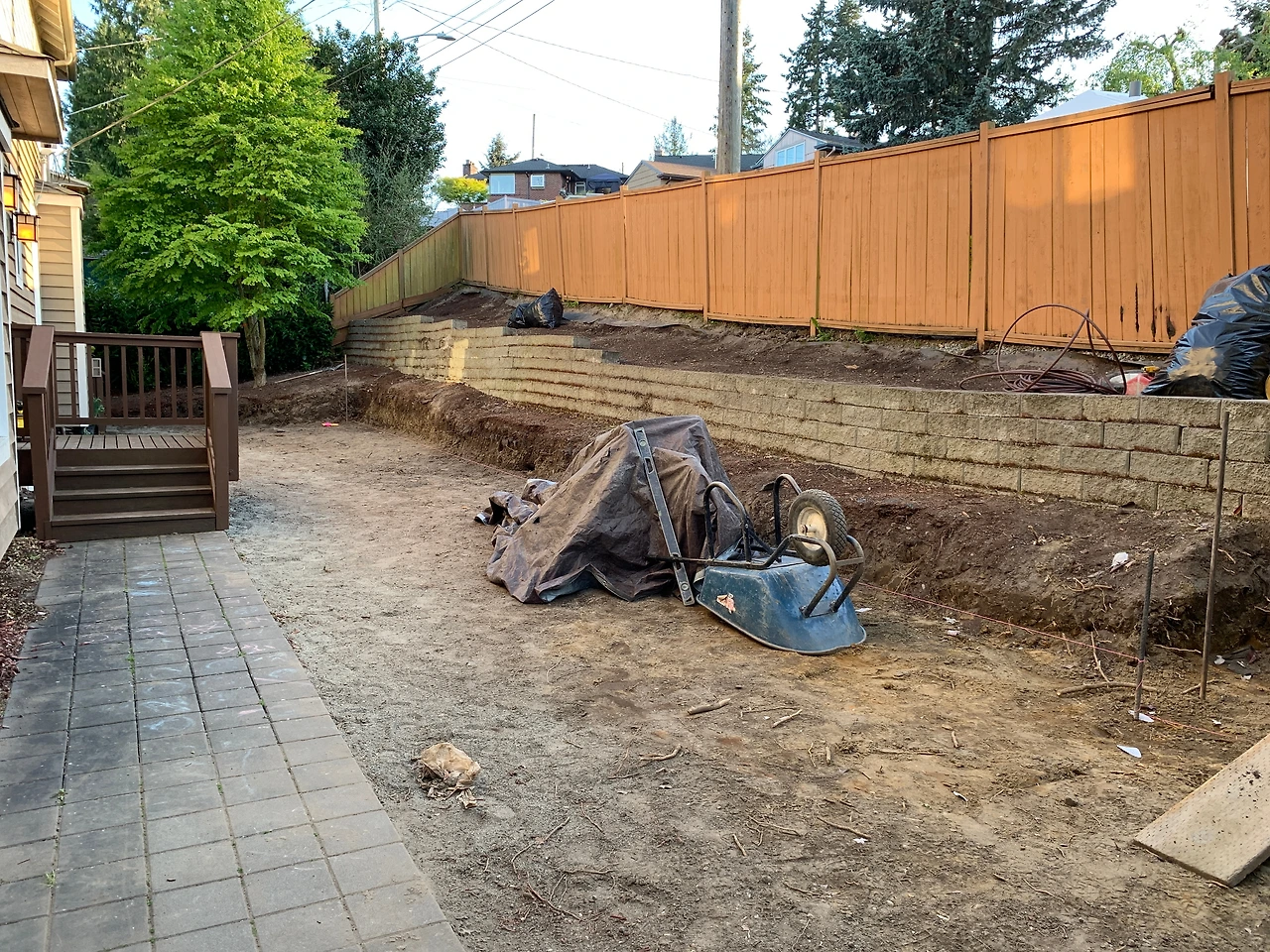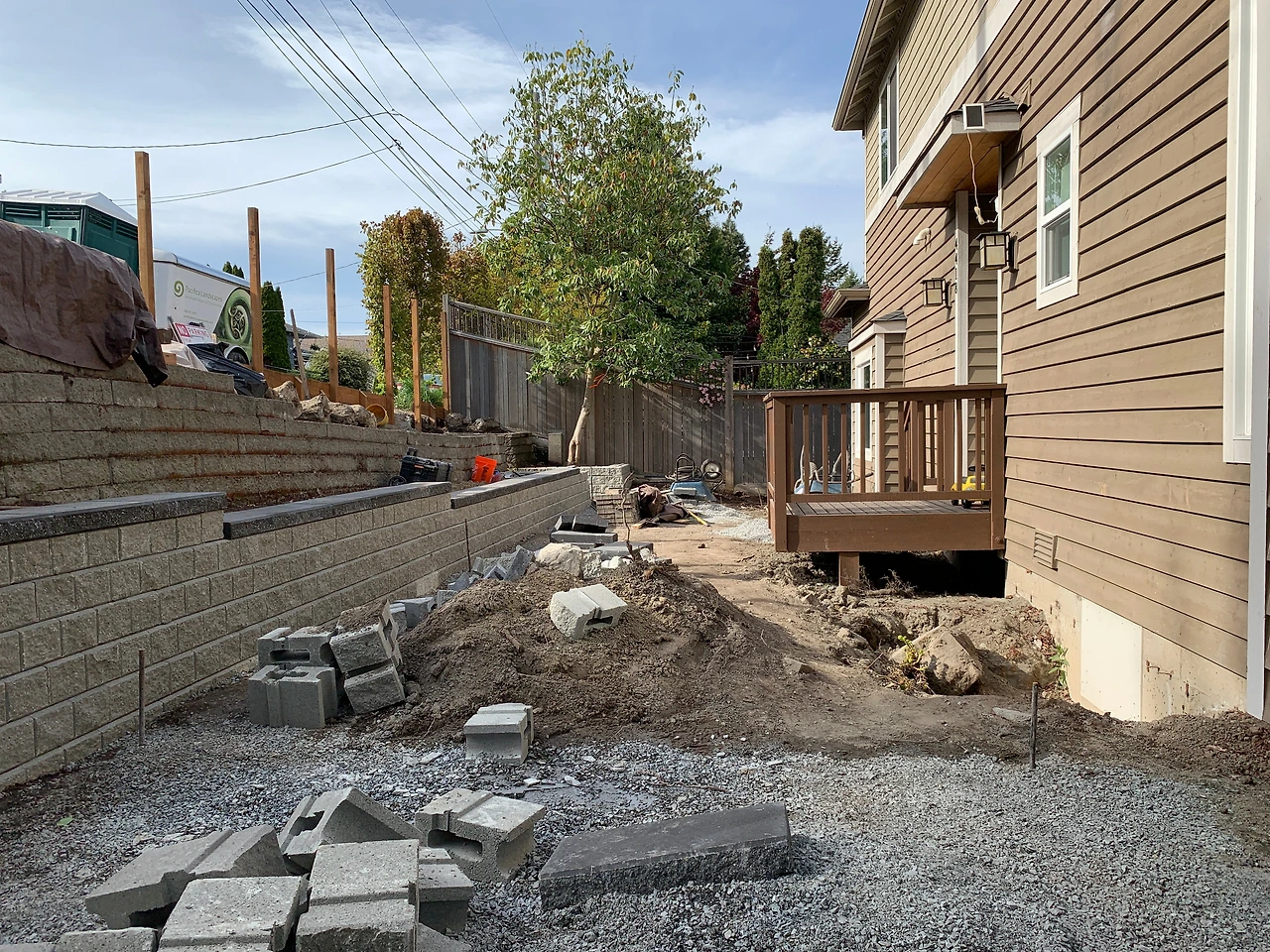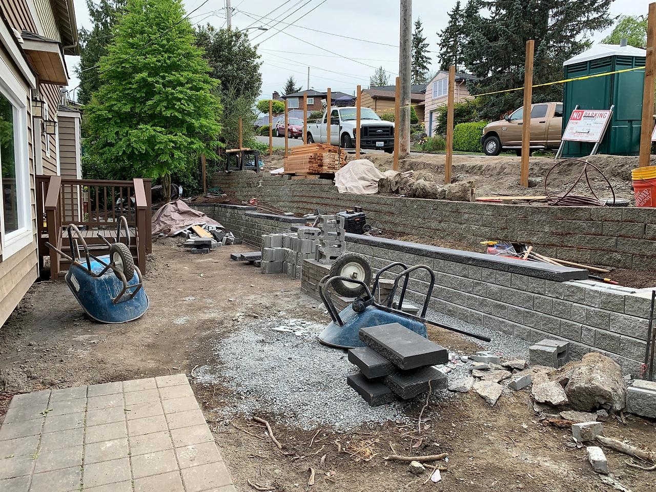 공사가 시작되기 전. 붉은 색 돌과 관리되지 않은 잡초들, 그리고 하나 같이 관리하기 어려운 나무들만 가득하다. 1주차 첫째날. 붉은 벽돌을 모두 제거하고 나무들을 잘랐다. 1주차 둘째날. 나무들과 돌들이 모두 없어졌다. 1주차 셋째날. 앞쪽 벽 설치를 위해서 흙이 제거되었다. 이로써 더 넓은 공간을 얻게 되었다. 1주차 넷째날. 입구쪽 땅 평탄화가 진행되면서 흙이 더 제거되었다. 1주차 다섯째날. 벽 설치를 위해서 땅을 파고 돌이 깔렸다. 2주차 첫째날. 앞쪽 벽이 조금씩 설치가 되고 울타리가 허물어졌다. 2주차 둘째날. 앞쪽 벽이 좀 더 모양을 갖추었고 새 울타리 설치를 위한 기둥이 세워졌다. 2주차 셋째날. 앞쪽 벽이 거의 완성이 되었다. 2주차 넷째날. 울타리 바깥 흙을 지탱할 버팀목과 입구쪽 나무 밑에 벽이 설치되고 현관 계단이 조정되었다. 2주차 다섯째날. 모든 벽이 완성되고 울타리 2차 버팀목이 설치되고 현관쪽 돌이 모두 제거되었다. 3주차 첫째날. 울타리 틀이 완성되고 평탄화 및 지대를 조금 높이기 위해서 흙이 추가되었다. 3주차 둘째날. 입구와 현관을 연결하는 블럭이 설치되고 울타리가 완성되었다. 3주차 셋째날. 파티오쪽 블럭이 설치되고 울타리 문이 설치되었다. 3주차 넷째날. 불필요한 흙들과 자재들이 정리되고 1차적으로 식물들이 심겼다. 또한 지하로 향하는 부분이 정리되었다. 3주차 다섯째날. 잔디가 깔리고 모든 식물들이 자리를 잡았다. 바깥은 지저분한 돌과 관리되지 않는 잡초로 가득했는데 잔디로 대체됐다. 위와 같이 공사과 완료된 후 며칠이 지난 뒤 입구 쪽 계단이 완성되고 그 뒤 몇 주가 지난 후에 입구 쪽 계단에 손잡이가 설치되면서 모든 공사가 완료되었다.