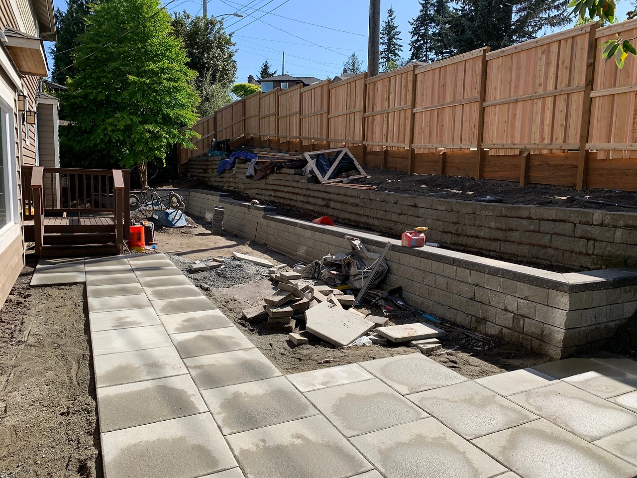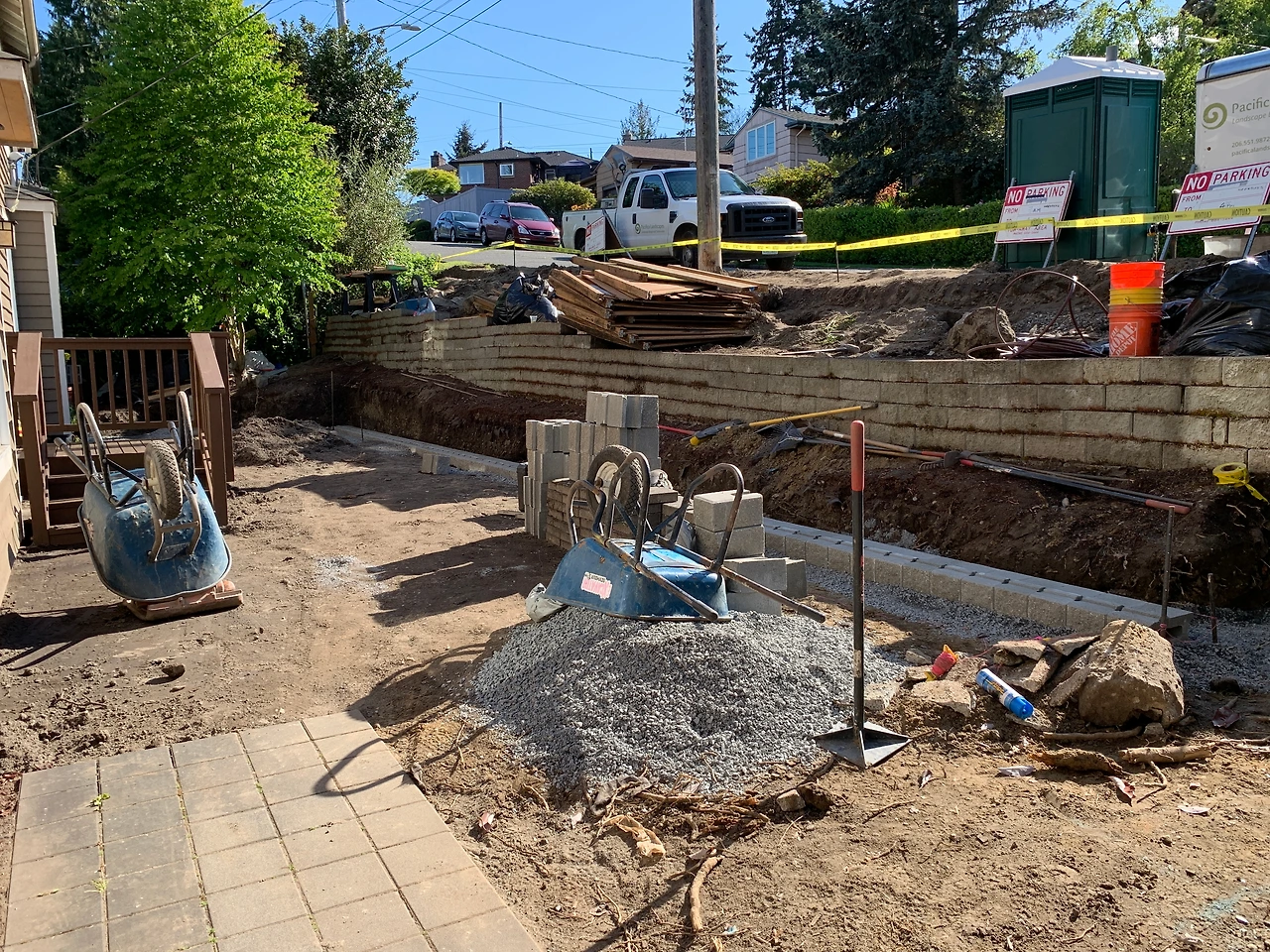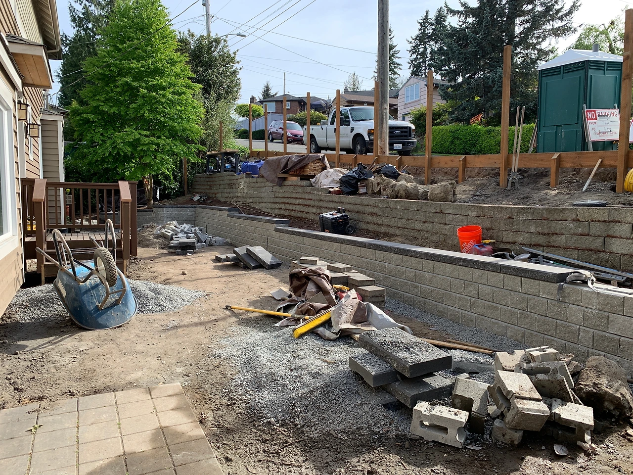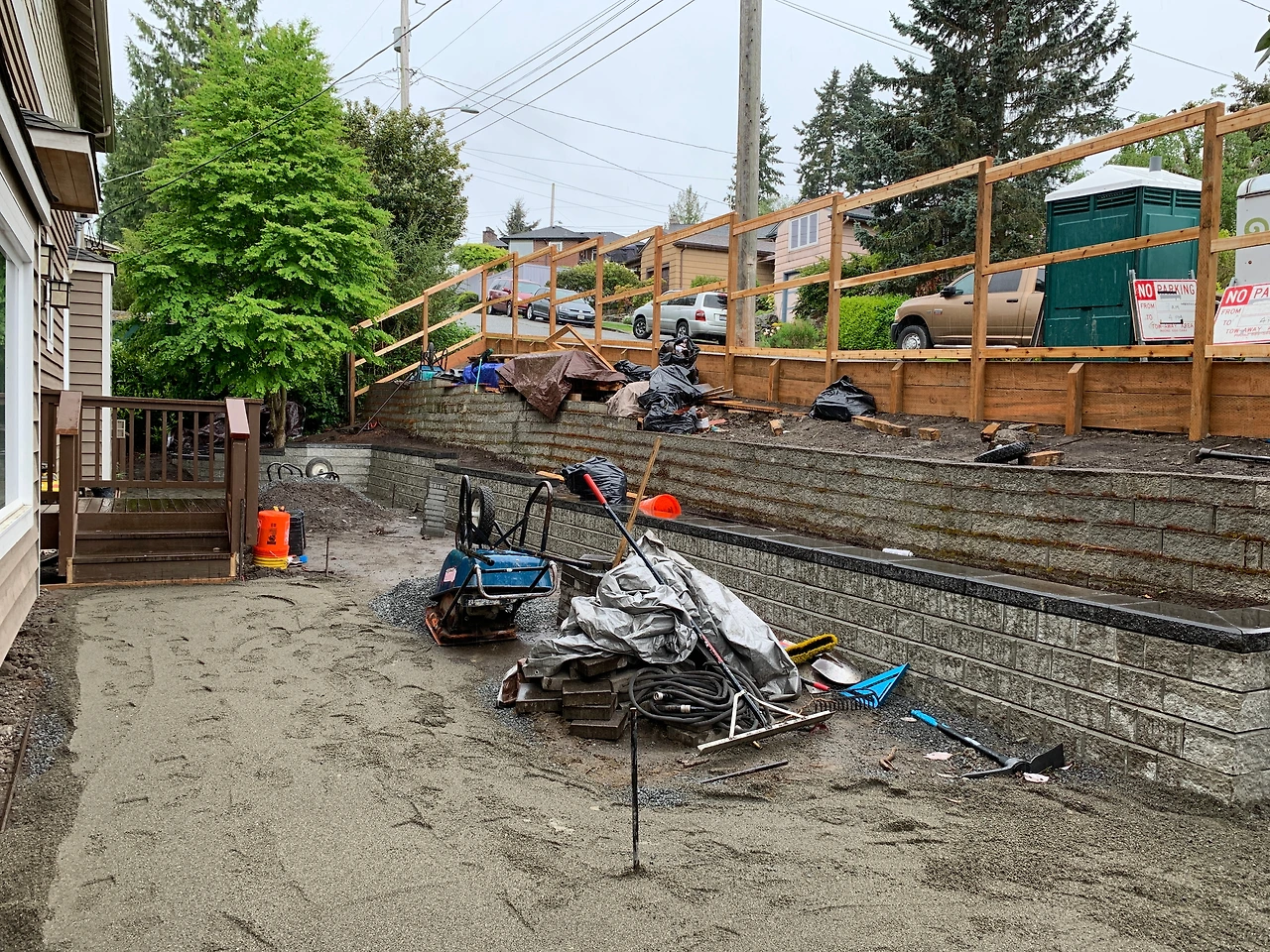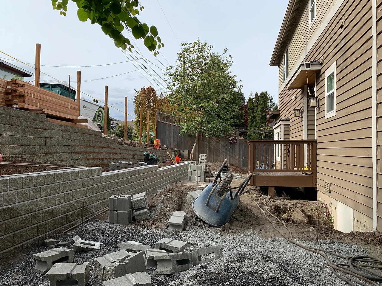 공사가 시작되기 전. 붉은 색 돌과 관리되지 않은 잡초들, 그리고 하나 같이 관리하기 어려운 나무들만 가득하다. 1주차 첫째날. 붉은 벽돌을 모두 제거하고 나무들을 잘랐다. 1주차 둘째날. 나무들과 돌들이 모두 없어졌다. 1주차 셋째날. 앞쪽 벽 설치를 위해서 흙이 제거되었다. 이로써 더 넓은 공간을 얻게 되었다. 1주차 넷째날. 입구쪽 땅 평탄화가 진행되면서 흙이 더 제거되었다. 1주차 다섯째날. 벽 설치를 위해서 땅을 파고 돌이 깔렸다. 2주차 첫째날. 앞쪽 벽이 조금씩 설치가 되고 울타리가 허물어졌다. 2주차 둘째날. 앞쪽 벽이 좀 더 모양을 갖추었고 새 울타리 설치를 위한 기둥이 세워졌다. 2주차 셋째날. 앞쪽 벽이 거의 완성이 되었다. 2주차 넷째날. 울타리 바깥 흙을 지탱할 버팀목과 입구쪽 나무 밑에 벽이 설치되고 현관 계단이 조정되었다. 2주차 다섯째날. 모든 벽이 완성되고 울타리 2차 버팀목이 설치되고 현관쪽 돌이 모두 제거되었다. 3주차 첫째날. 울타리 틀이 완성되고 평탄화 및 지대를 조금 높이기 위해서 흙이 추가되었다. 3주차 둘째날. 입구와 현관을 연결하는 블럭이 설치되고 울타리가 완성되었다. 3주차 셋째날. 파티오쪽 블럭이 설치되고 울타리 문이 설치되었다. 3주차 넷째날. 불필요한 흙들과 자재들이 정리되고 1차적으로 식물들이 심겼다. 또한 지하로 향하는 부분이 정리되었다. 3주차 다섯째날. 잔디가 깔리고 모든 식물들이 자리를 잡았다. 바깥은 지저분한 돌과 관리되지 않는 잡초로 가득했는데 잔디로 대체됐다. 위와 같이 공사과 완료된 후 며칠이 지난 뒤 입구 쪽 계단이 완성되고 그 뒤 몇 주가 지난 후에 입구 쪽 계단에 손잡이가 설치되면서 모든 공사가 완료되었다.