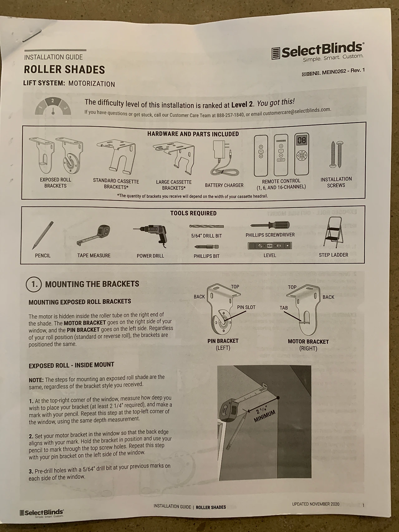 먼저 설명서를 꼼꼼하게 읽어봤다. 무슨 구성품이 들어있는지 그리고 어떻게 설치하는지를 설명해준다. 하지만 막상 구성품을 열었을 때는 약간 당황스러웠다. 위의 설명서처럼 블라인드 롤을 고정하는 브래킷 (그림 상의 Exposed Roll Brackets)이 있어야 할 듯싶었는데 없었다. 물론 그 덕에 설치는 더 간단했지만. 또한 충전 단자가 오른쪽에 있다고 했는데 실제 블라인드에는 왼쪽에 있어서 한 번 더 당황했다.