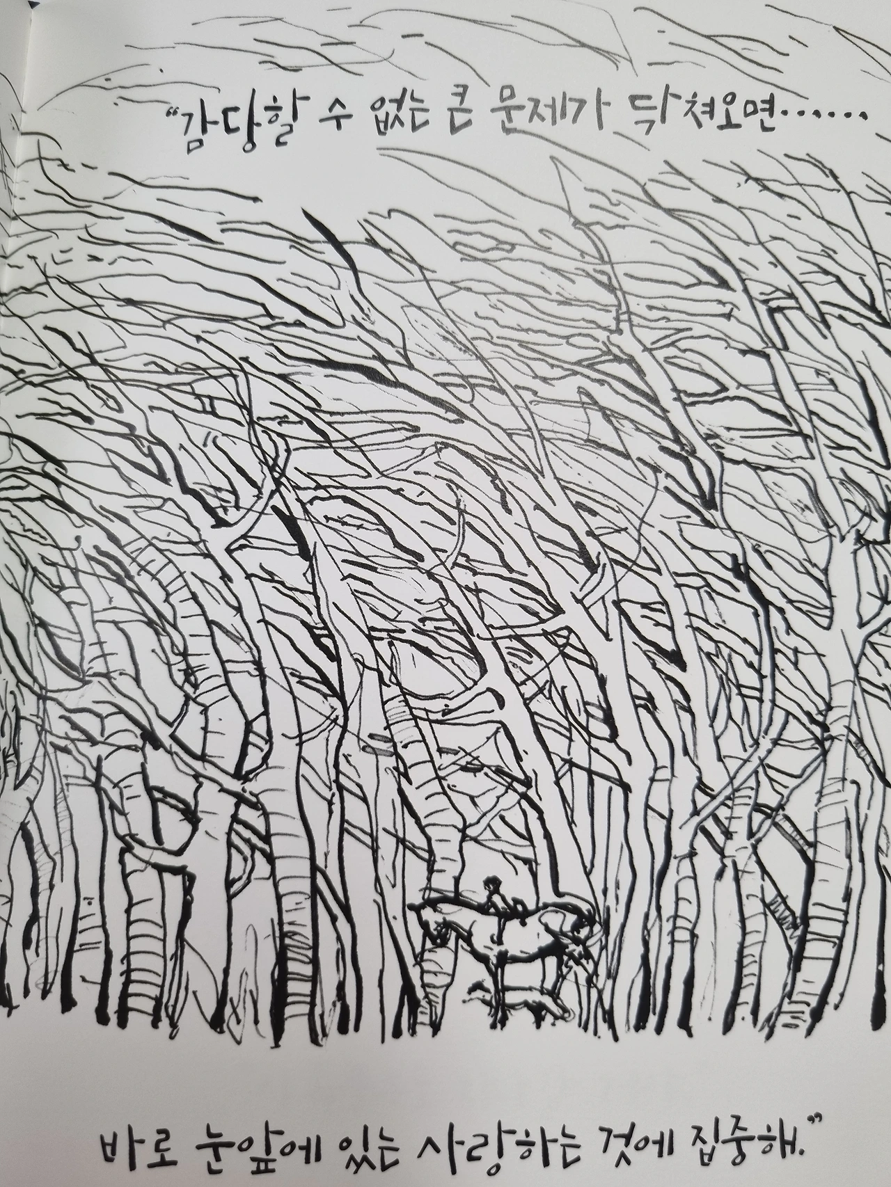 살면서 마음의 평화를 유지하기 위한 자세나 태도는 앞서 이야기한 것과 같이 '사라져 버리고 싶다'라고 여기는 순간 그 생각에서 벗어나면 그만인 것이다. 하지만 말이 쉽지 이건 결코 간단한 문제가 아니다. '내가 삶이란 무엇이고, 죽음이란 무엇인가'라는 과제를 떠올릴 수 있었던 건 내가 생각이 나고, 나의 생각이 궁금해하는 사람이라는 존재가 있었기 때문에 가능한 것이었다. 말하자면 마음의 평화를 유지할 수 있는 자세는 사람에서 비롯된다. 내가 사라져 버리고 싶은 건 타인에게 좋은 영향을 미치지 못하는 자책이고, 스스로 통제하지 못하는 자괴감에서 오는 것인데 이런 생각을 멈추게 하는 건 사람이다. 더 자세하게 풀어서 말하자면 사람이 내게 주는 위로, 사랑, 관심이 마음의 평화를 유지하는데 도움이 된다. 하지만 이것도 내 생각이 바뀌지 않는다면 나는 마음의 평화를 유지할 수 없다. 결국엔 마음의 평화를 유지하기 위한 자세는 나의 생각을 사랑에 머물도록 하는 자세가 중요한 것이다. 다시 아이의 탄생 순간으로 돌아가자면, 나는 한 생명이 정말 사랑스러워, 모든 순간을 함께하지 못할 거라는 그 짐작에 죽음을 생각하고 슬픔을 느낀 것이다. 그렇다면 한 존재의 삶과 죽음 그리고 마음의 평화는 사랑에서 시작되며 사랑으로 끝난다고 볼 수 있다. 그러니 나는 내 삶을 사랑하지 않으면 안 되고, 사람을 사랑하지 않으면 안 되는 것이다.