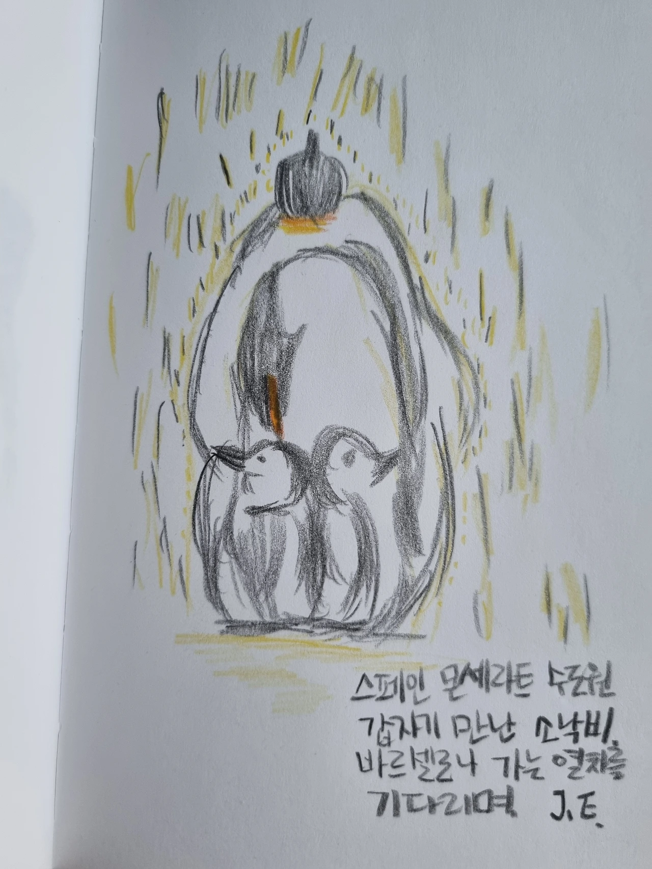 그리고 우린 첫째가 4학년 둘째가 2학년이 된 결혼 12년 차에 여행을 떠났다. 한 달 반 동안 우린 여러 나라를 돌아다니며 많은 추억과 사진을 남겼는데 내 기억에 자리 잡은 최고의 장면을 떠올려 보자면 바로 스페인 몬테라트 수도원을 돌아보고 숙소가 있는 바르셀로나로 가는 기차를 기다릴 때이다. 갑자기 비가 내렸다. 나는 내 겉옷을 벗어 아이 둘을 감쌌고, 그런 나를 감싸서 자기 몸으로 우리의 우산이 되어준 남편. 그 남편이 정말 든든하게 여겨지고 우리 모습이 마치 황제 펭귄 가족 같았다.
