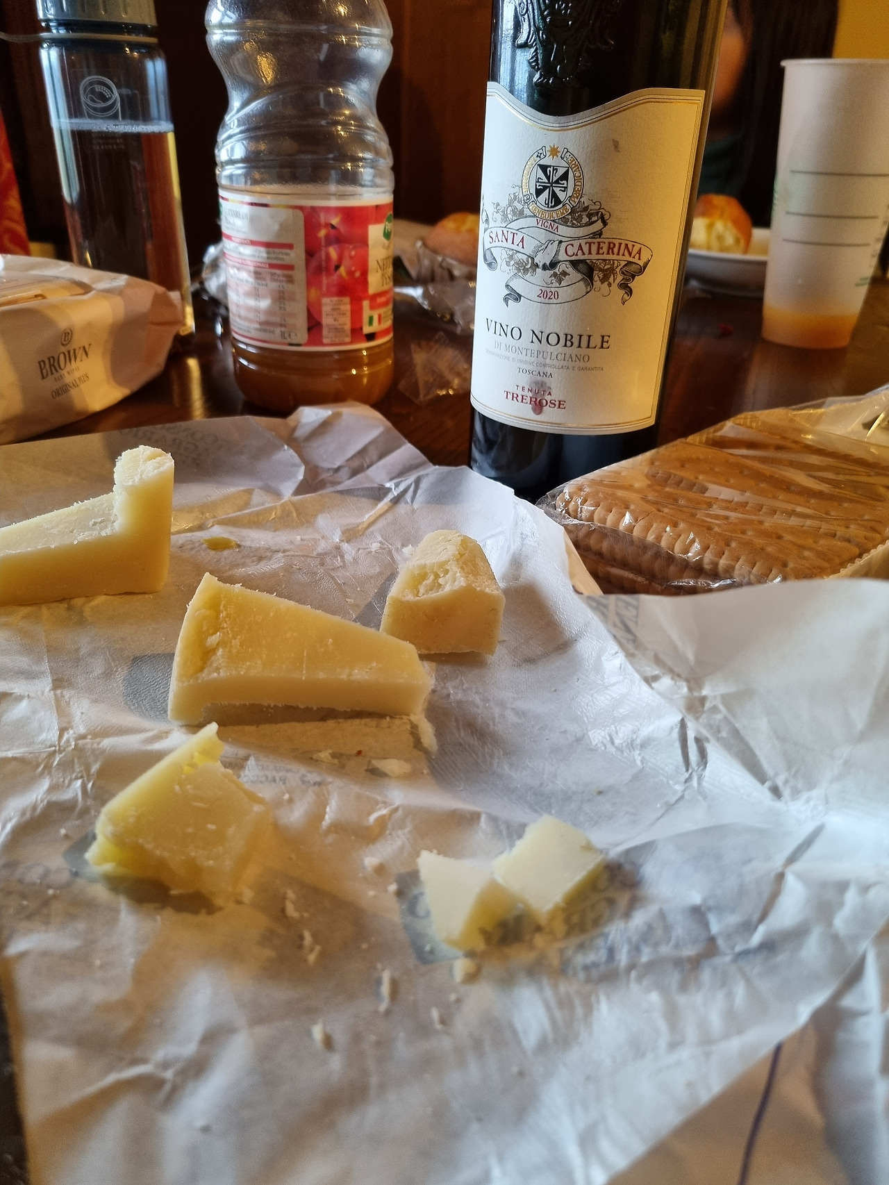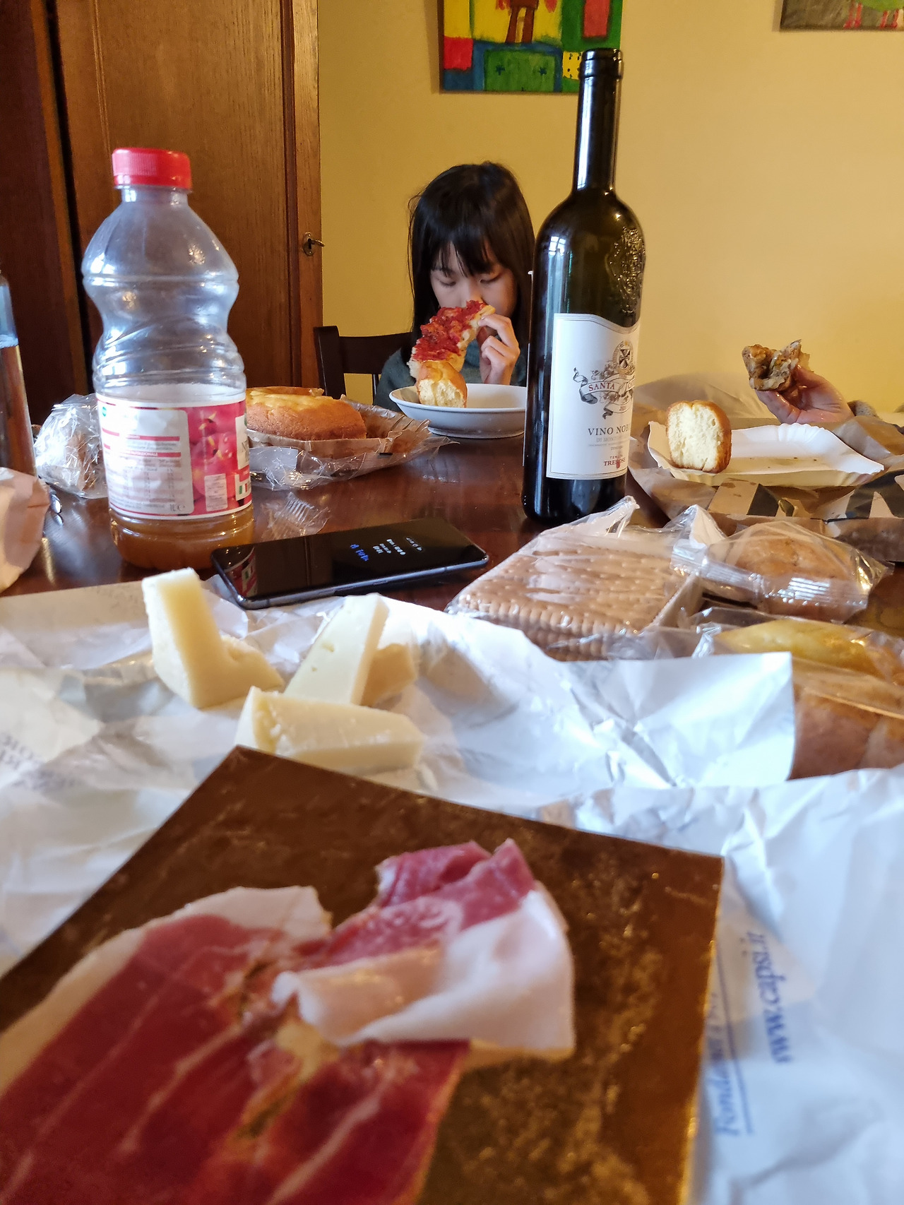 우리는 숙소에서 간단하게 저녁을 해결했다. 빵과 아시시 로컬 마트에서 사 온 프로슈토와 남편이 고른 현지 와인, 그리고 그 와인과 어울리는 치즈를 추천해 달라고 부탁해서 사 온 치즈로 처음으로 이탈리아에서 프로슈토와 치즈를 도전했다. 그리고 별것 없는 상차림에서 행복을 느꼈다. 아마 그 시점을 시작으로 남편 펭귄은 와인에 관심을 가지게 되었고, 나는 치즈에 관심을 가지게 되었다. 그리고 우리는 현지에서만 맛볼 수 있는 여행의 묘미를 느끼며 여유롭게 밤을 즐겼다. 사실 현지 마트에서 나보다 의사소통이 자유로운 남편 펭귄에게 와인과 어울리는 치즈를 물어보라고 시켰다. 투덜거린 남편이지만, 현지인인 푸드 코트 사장님이 아주 친절하게 설명을 해주며 우리가 먹을 만큼의 양을 잘라서 판매해 주셨다. 그래서 남편 펭귄에게