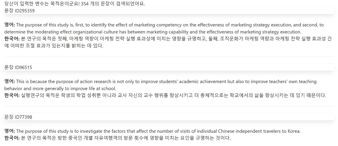사용법은 아주 간단합니다. 아까 제가 보여드린 문장들 역시 "연구의 목적", "연구대상은"이라는 키워드로 검색한 결과물입니다. 검색 문장 수 자체가 방대하다 보니, 골라서 쓸 수 있습니다.