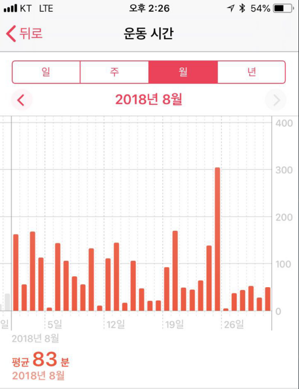 8월 한달 나의 평균 운동시간은 83분이다. 하루 300분 운동을 했다고 기록된 날이 있는데, 토요일에 라운딩이 나갔는데 그게 다 운동으로 기록된 것 같다.