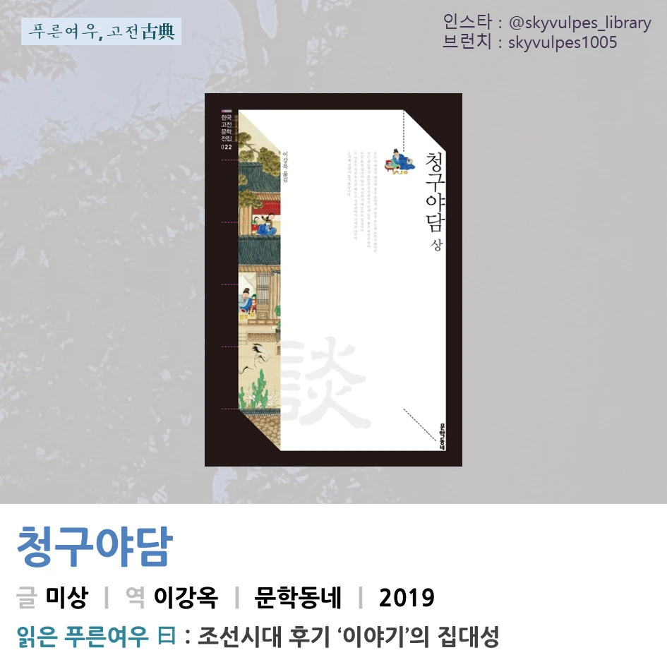 조선시대 후기의 사회상을 잘 담고 있는 편찬자 미상의 <청구야담>입니다. 고전 자체에 친숙하지 않은 분들은 '야담'이라는 장르 자체에 대해서도 많이 생소하실 듯해요. 한국민족문화대백과사전에서는 '조선 후기에 한문으로 기록된 비교적 짤막한 길이의 잡다한 이야기'라고 정의하고 있습니다만, 이 정의만으로 야담이 지닌 복합적인 특성을 온전히 이야기하기는 조금 어렵다고 할 수 있겠습니다.