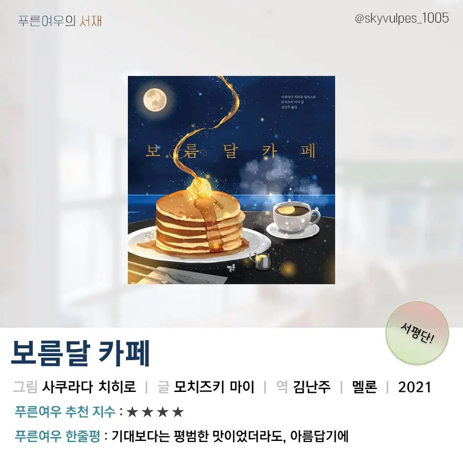 그러나 작가진은 보는 사람마저 사로잡는 화려한 작화와 천문학이 주는 메시지를 결합시킴으로써 이러한 우려를 깔끔하게 걷어냅니다. 주인공에게 대접되는 다양한 디저트는 기발하면서도 화려하게 일러스트로서 구현되며, 결코 작품의 내용을 소홀히 하지 않았습니다. 각각의 디저트는 보름달, 수성, 은하수 등 우주를 본떠서 만들어졌으며, 디저트가 각각 품고 있는 의미와 상징은 주인공이 품고 있는 상처를 절묘하게 치료해줍니다. 또한 처음에 제시되었던 복선을 결말에 회수하면서 책을 마지막 장까지 넘긴 독자들에게 뜻깊은 감동을 선사하는 데에도 성공합니다. 작품의 분위기에 걸맞게 어슴푸레하면서도 반짝반짝 빛나는 수려한 그림체에 결코 부족하지 않은 스토리가 어우러져 작품 <보름달 카페>를 찾은 독자들 누구나 삼색 고양이가 제공하는 디저트에 고개를 끄덕이며 만족하실 듯합니다. 소설로도 출판된 바가 있고, 일러스트레이터 분도 인스타에 지속적으로 보름달 카페 메뉴를 올려주시니 관심 있으신 분들은 찾아보셔도 좋겠네요.