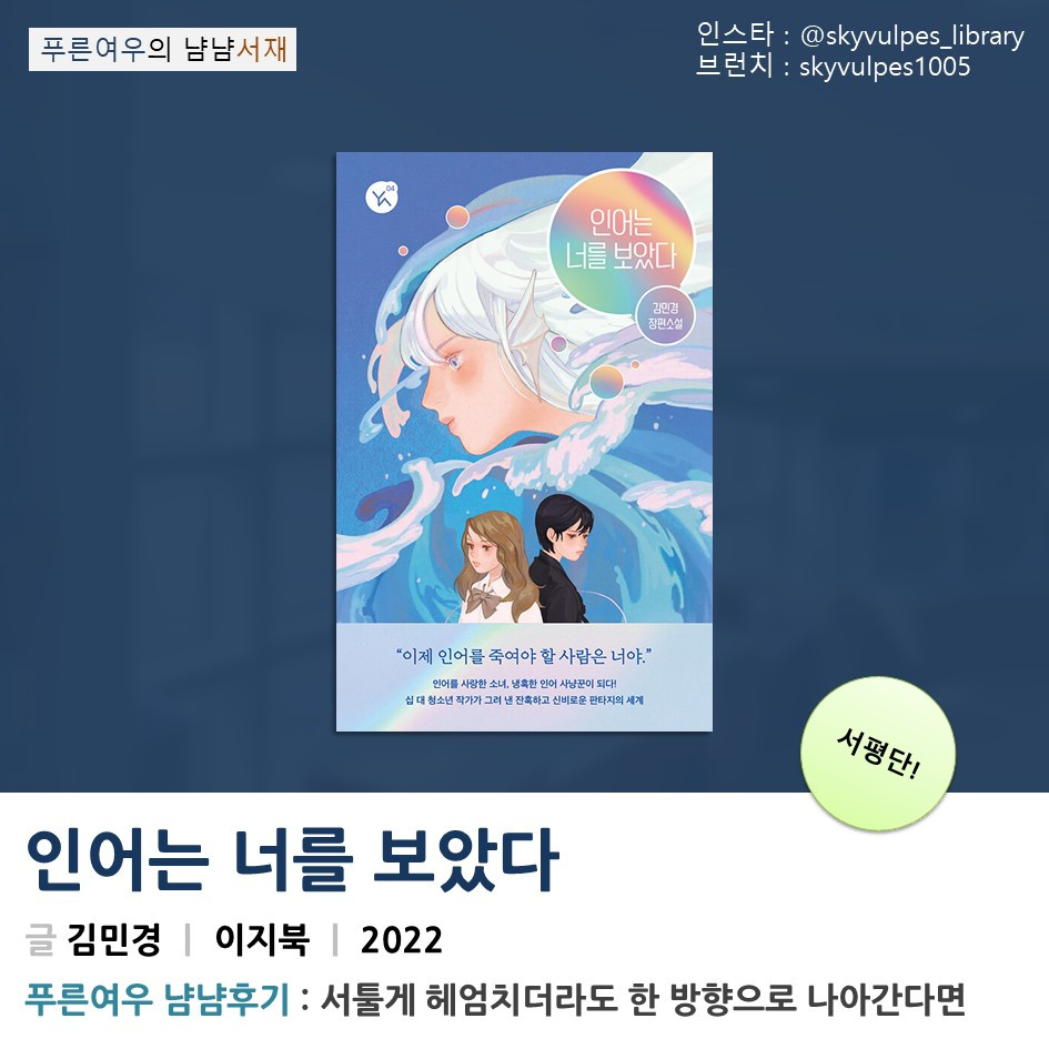 김민경 작가님의 <인어는 너를 보았다>입니다. 개인적으로 저는 뒤표지에 쓰인 '십 대 청소년 작가'라는 작가 소개보다도, '인어를 사랑한 소녀, 인어 사냥꾼의 몸으로 깨어나다!'라는 소개 문구에 눈길이 갔습니다. 그만큼 작가님의 나이대보다도 스토리 자체에 관심을 갖게 하는 이 작품에 큰 기대를 가질 수밖에 없었습니다.