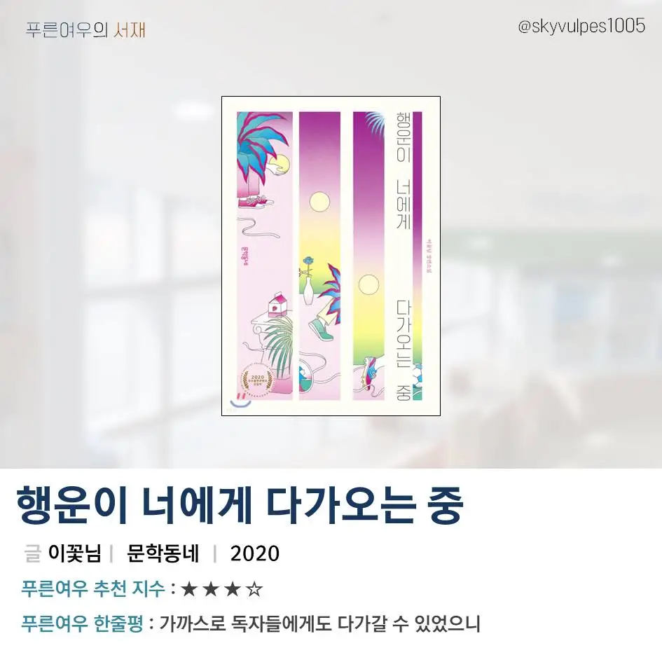 <세계를 건너 너에게 갈게>를 쓴 이꽃님 작가님의 <행운이 너에게 다가오는 중>입니다. 이번 작품에서 가장 눈에 띄는 점이라고 한다면 바로 서술자라고 이야기할 수 있겠는데요. 최근 들어서 아예 신을 서술자로 내세운 ‘1인칭 전지적 작가 시점’까지도 등장하고 있습니다만, 이렇게 ‘운’이라고 하는 추상적인 녀석을 서술자로 내세운 책은 아마도 처음이 아닐까 싶습니다. 이 책의 독특한 서술자는 목에 서늘한 바람을 불어넣어 등장인물들이 위험을 예견할 수 있도록 이끌어주기도 합니다.