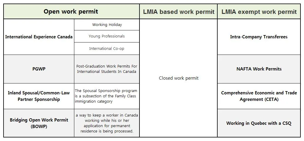 캐나다의 취업비자는 총 3가지 종류로 이루어져 있다.