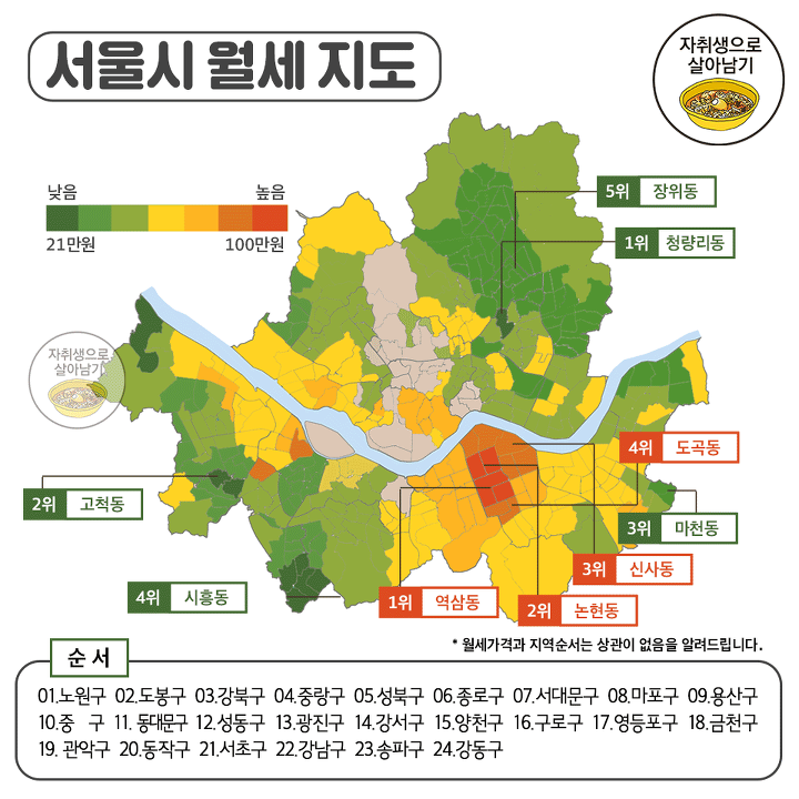 서울시 월세지도(좌) 광역 토론토 지역별 월세 표(우)