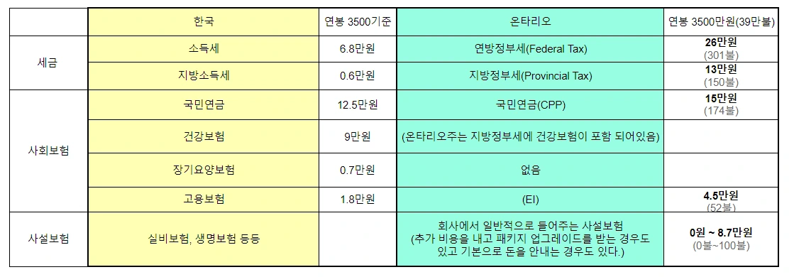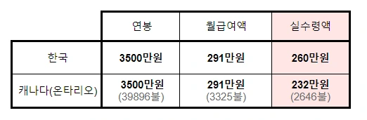 3500만 원 기준 한국과 캐나다(온타리오)의 실수령액 비교