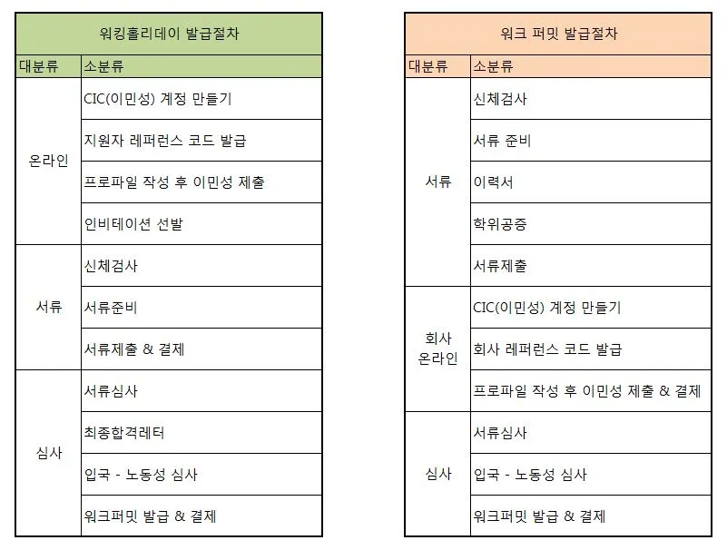 구독자 여러분의 상세한 비교를 위해 하단에 워킹홀리데이 발급 절차와 워크퍼밋 발급 절차를 비교해 표를 직접 만들어 보았다. 워킹홀리데이 발급 절차의 경우 네이버 카페 " 캐나다 워홀 카페"에서 참고하였으므로 100% 확실한 정보이나, 우측의 워크퍼밋 발급 절차의 경우 필자 시점에서 바라본 절차이기 때문에 약 90% 정도만 믿고 보면 좋을 듯싶다.