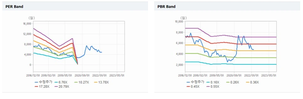 다음으로 주목하는 지수는 주식을 선택했던 시점에 언급됐던 PBR이다. 성우하이텍의 영업이익의 폭이 들쭉날쭉했기에 정확한 PER은 일정하지 않아서 PER 밴드로서 계산이 어려운 대신 PBR의 경우 최근의 흐름을 보면 0.16 ~0.55 사이를 왔다 갔다 하는 것을 볼 수 있다. 이를 범위를 좁혀 밴드 상하단의 폭을 계산하면 주된 흐름을 0.26~0.44의 폭에서 주기적으로 변화하고 있다. 내가 성우하이텍을 매수했던 0.3이하의 PBR이면 최저는 아닐지 몰라도 충분히 매수를 고려할 만한 밴드 하단에 가까운 포지션으로 만약 다시 PBR이 0.3이하로 왔을 시에는 매수를 고민해 봐도 괜찮을 것 같다는 성급한 결론도 도출해 본다.(물론 다른 지표도 감안해 봐야겠지만...)