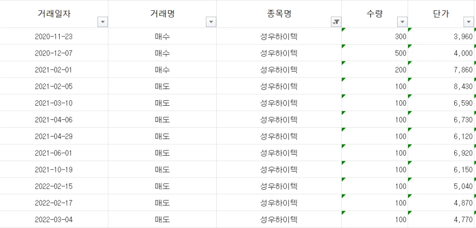 나의 성우하이텍의 평단은 4760원으로 2020년 2월 1일 200주를 매수했던 것이 4000원 미만이었던 평단을 대폭 끌어올려 주었다. 매도 일지를 보면 분할매도도 이런 분할매도가 없을 정도로 1000주의 주식을 1년 동안 900주를 꾸준히 정리하면서 이제 마지막 100주를 남겨두고 있다. 매도 형태만 보면 100주씩 감정없이 매도하는 프로그램 매도 형태로 그냥 주식이 떨어지니 팔아제꼈다.
