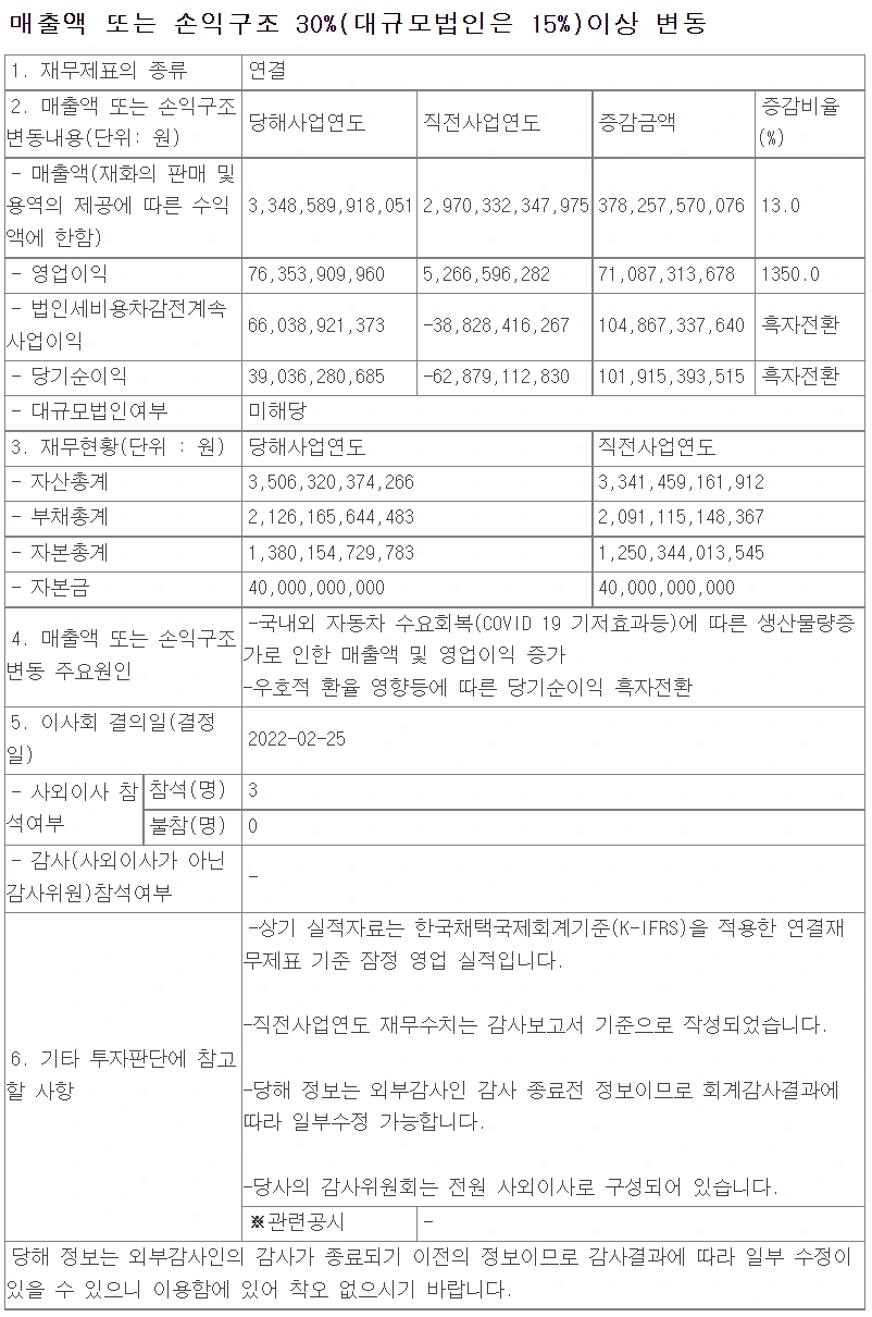 100주 밖에 주식이 남지 않은 시점에서 왜 이 주식이 안되었는지를 살펴볼 필요가 있다. 그리고 오랜만에 전자공시시스템을 켰다. 가장 최근 2022년 2월 25일에 주주총회 소식과 함께 매출액 또는 손익구조 30%(대규모 법인은 15%) 이상 변동에 대한 공시가 있다. 우선 가장 눈에 띄는 것이 당해 연도 영업이익에 대한 항목인데 증감비율이 1350%라는 놀라운 이익 성장률 고시가 눈에 띈다. 매출 상승 원인이로는 국내외 자동차 수요 회복에 따른 생산물량 증가로 인한 매출액 및 영업이익의 증가인데... 역시 2021년 내내 자동차 섹터를 괴롭혔던 자동차용 반도체 수급난이 이제 어느 정도 회복 단계에 있지 않을까라는 추측을 해본다. 그런데 왜 연 매출이 3조가 넘고 4분기 한정(예상) 매출액 8,687억 원, 영업이익 186억 원 단순 수치만 따지면 주가가 좋진 않아도 지금처럼 52주 신저가 근처에 있을 주식은 아닌데 왜 그때와 지금은 이렇게 상황이 달라졌을까? 나는 그 이유가 궁금해졌다.