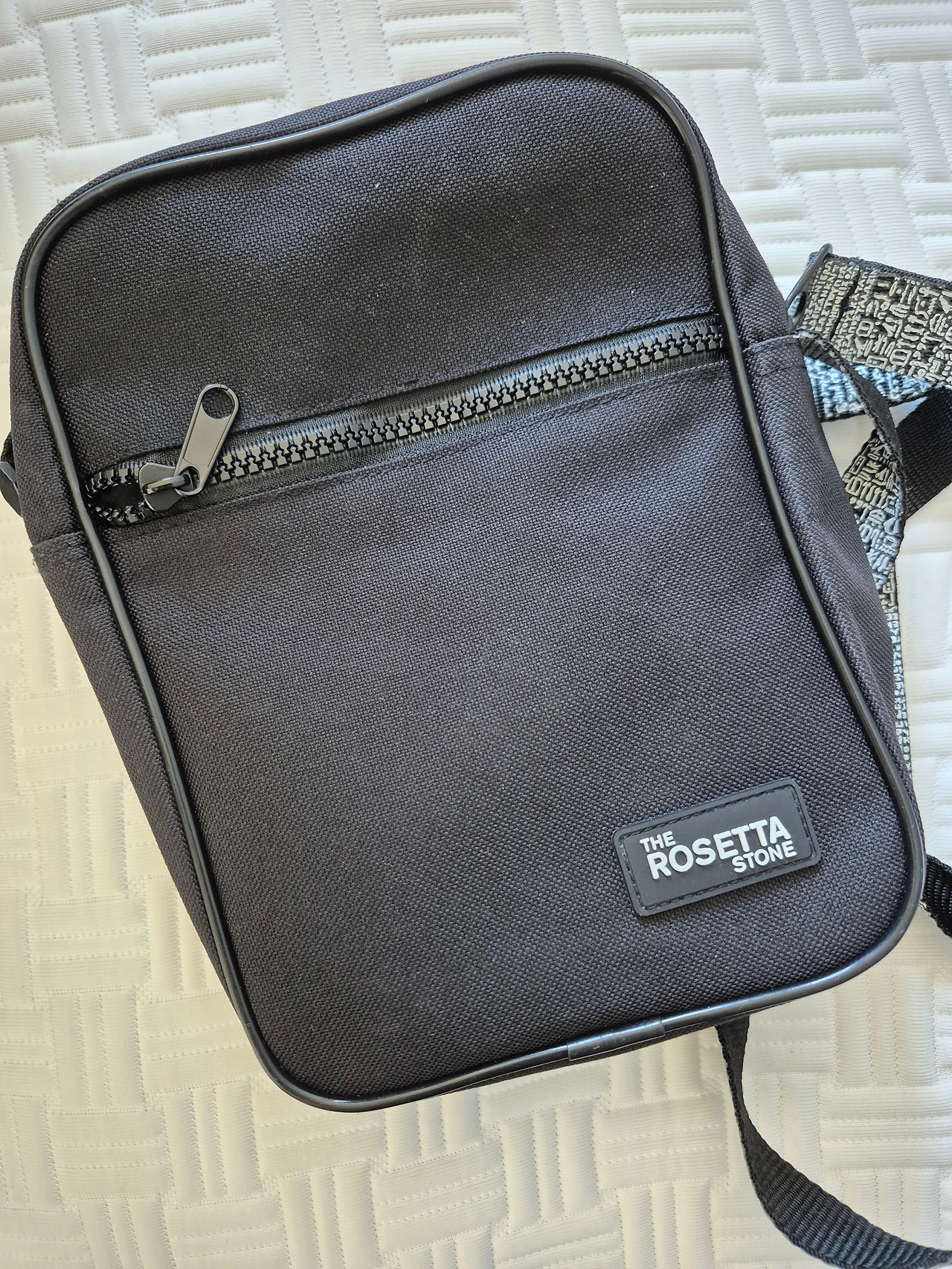 메고 있는 크로스백은 영국박물관 기념품. 로제타스톤 문구가 어깨에 메는 줄에 가득 적혀있다. 전면에 로제타스톤이라고 써 있어서 어학학습 프로그램 기념품인지 알 수도.