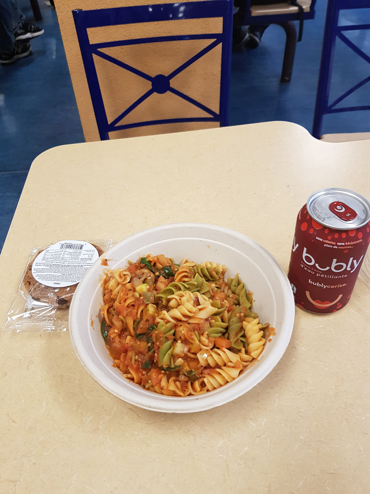 어느날 먹은 학식 파스타. 파스타는 커스텀메이든데 protein을 넣지 말아달라고 했다. 왼쪽은 비건쿠키고 오른쪽은 체리맛 탄산수.