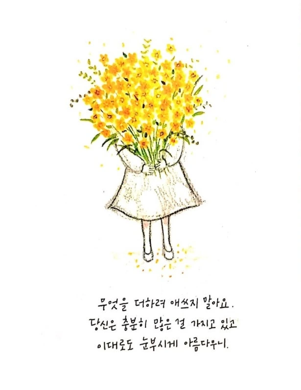 누구나 있는 그대로로 존중받고 사랑받을 자격이 있으니까, 너무 애쓰지 않아도 괜찮다고, 이만하면 좋다, 내 노력만큼 최선을 다하고 나머지는 하늘에 맡기기. 모든건 순리대로, 조금만 마음의 힘을 빼자.
