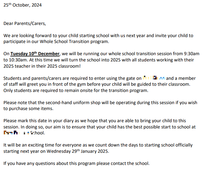 12월 10일에는 2025학년도 새롭게 바뀐 교실과 새 선생님 등을 소개하는 Transition Session이 제공될 예정이며, 중고 교복을 구입할 수 있는 내용도 포함되어 있었다. 멜버른의 대부분의 공립초등학교에서는 교복을 입는 경우가 많은데, 제제가 가게 될 학교 또한 교복을 입게 된다. 알아보니 새 교복은 한 벌정도로 구입하고, 중고 교복을 저렴하게 구매해서 사용하는 경우가 많았다.