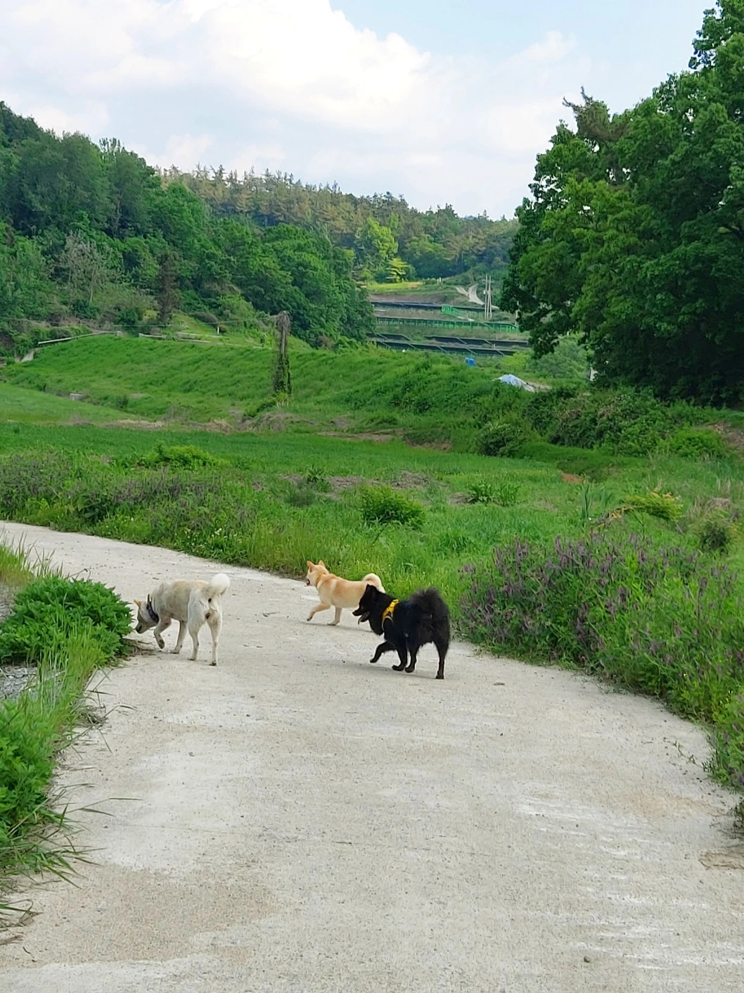 바람이 불었고 고요한 인적없는 시골 마을, 간만에 목줄이 없는 개들은 편안해 보였다. 복실이가 경험해보지 못한 세상을 만두와 인절미가 대신 살아주는 건가 싶기도 했다.