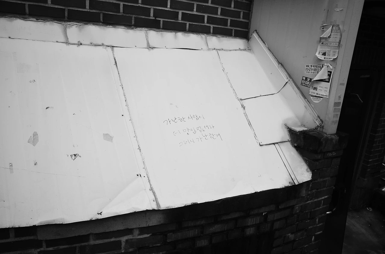 점심시간을 이용해 후암동 거리를 거닐며 사진을 찍었다. 후미진 골목이 많은 곳이다. 그곳에서 낙서 하나를 발견했다. “가난한 사람이 더 양심 없더라 그러니 가난한겨” 누가 어떤 마음으로 썼는지는 알 갈이 없다. 이것은 이것을 쓴 당사자에게 사실일 수도 있고 진실일지도 모른다. 둘 다 아니지만 부러 위악적인 문구를 남겨놓았는지도 모른다. 사연이 있겠거니, 하며 카메라에 담고 발길을 돌렸다.