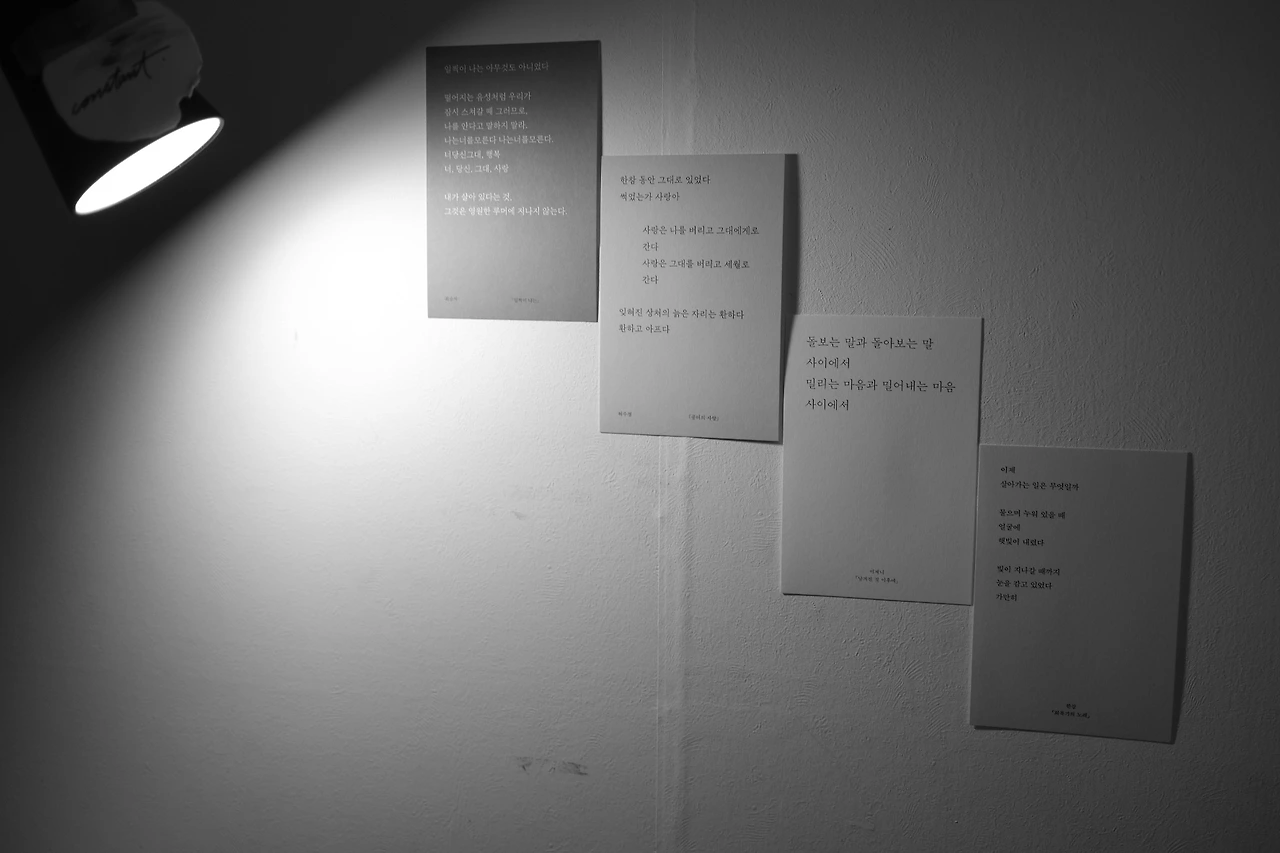 2021년 첫 연휴 마지막 날, 작업실에 왔다. 지난날의 흔적들을 정리하고 벽 한켠에 엽서를 붙였다. 얼마 전 위트 앤 시니컬에서 시집을 사고 받은 굿즈로 최승자, 허수경, 이제니, 한강 시인의 시구절이 적혀있다. 별뜻 없이 붙였는데 연결해 읽으니 하나의 새로운 시가 탄생한 것만 같아 여러 차례 곱씹어 읽었다.