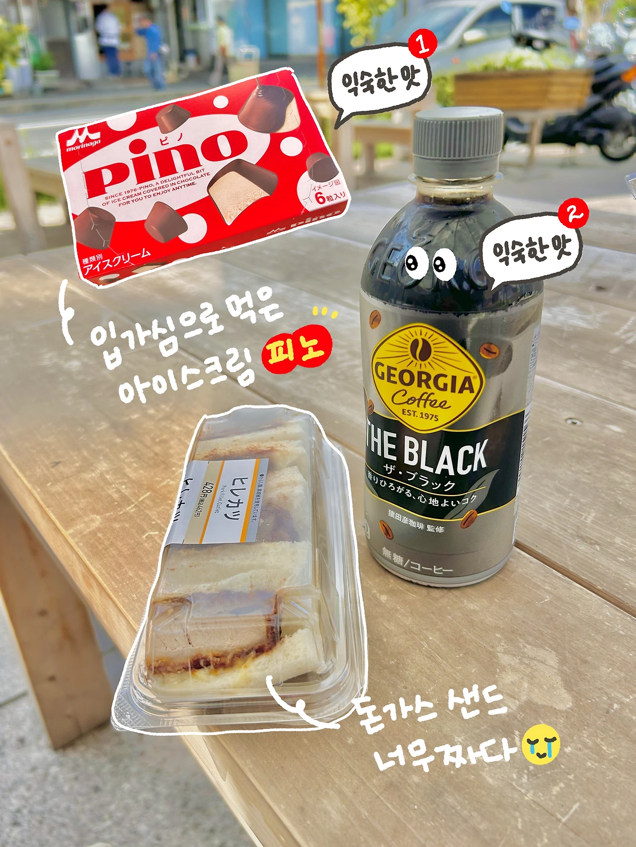 편의점에서 돈가스 샌드위치랑 블랙커피를 계산했다. 야외 파라솔 벤치에 앉았다. 그늘 아래서 샌드위치를 먹으며 오노미치 상점가를 감상했다.
