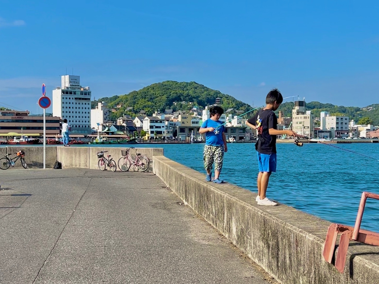 숙소 창문을 열면 늘 바다 건너 작은 섬이 보였다. 바로 무카이시마 섬이다. 여긴 관광지라기보다 평범하고 조용한 시골 동네 같은 분위기였다. 섬을 짧게 도는 동안, 동네 사람들을 거의 마주치지 못했다. 바닷가 근처에 낚시하는 사람들과 아이들만 보일 뿐이었다. 동네 아이들끼리 낚시하는 모습이 인상적이었다. 생활이자 놀이에 가까운 익숙함.