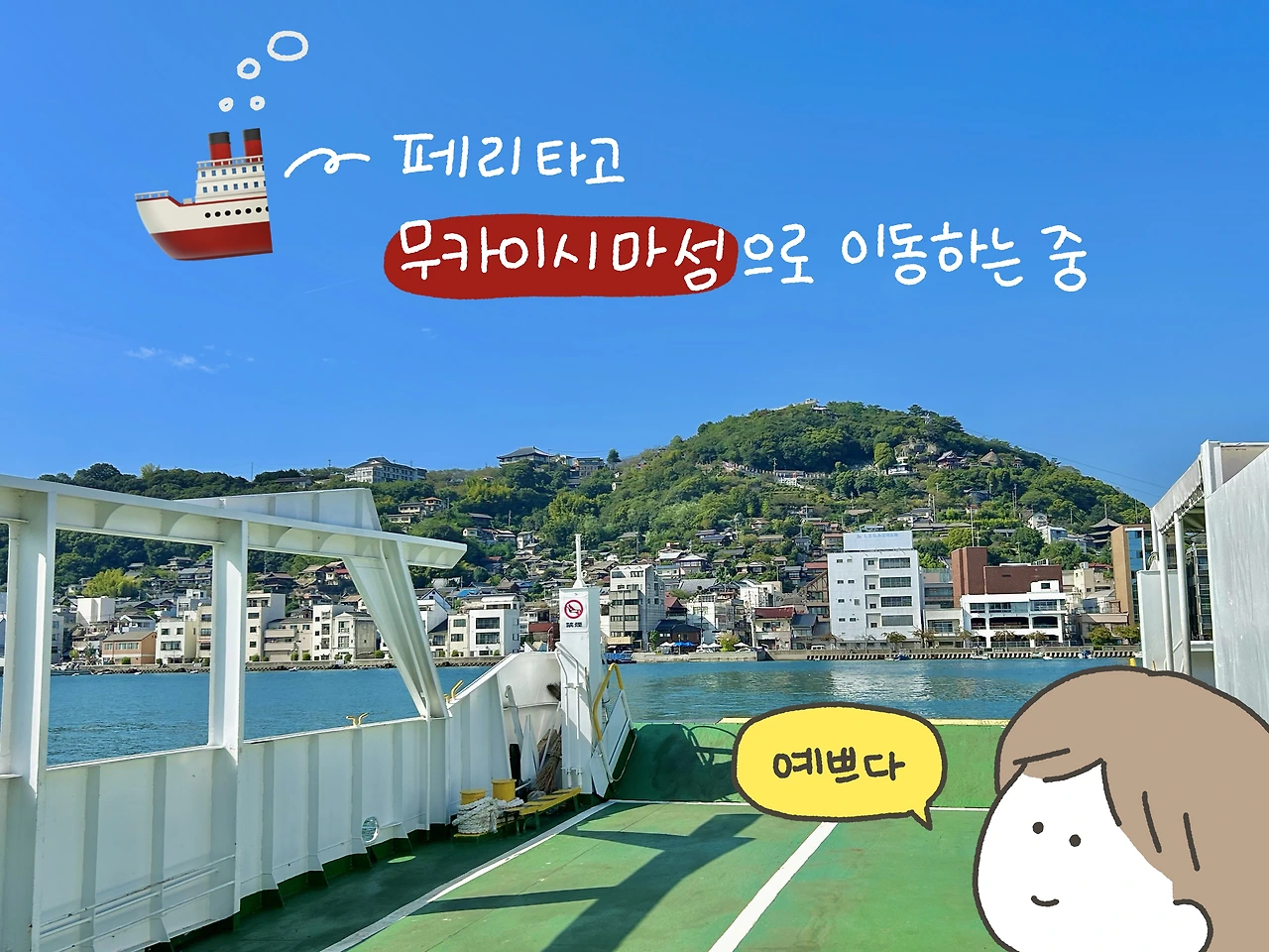 현재 위치는 숙소 인근의 페리 선착장. 바다 건너편에 위치한 무카이시마 섬에 가보기로 했다. 이동수단이 되어줄 페리의 편도 요금은 성인 100엔, 어린이 50엔, 차량 30엔. 페리가 출발하면 승무원 아저씨가 돌아다니며 요금을 걷는다.
