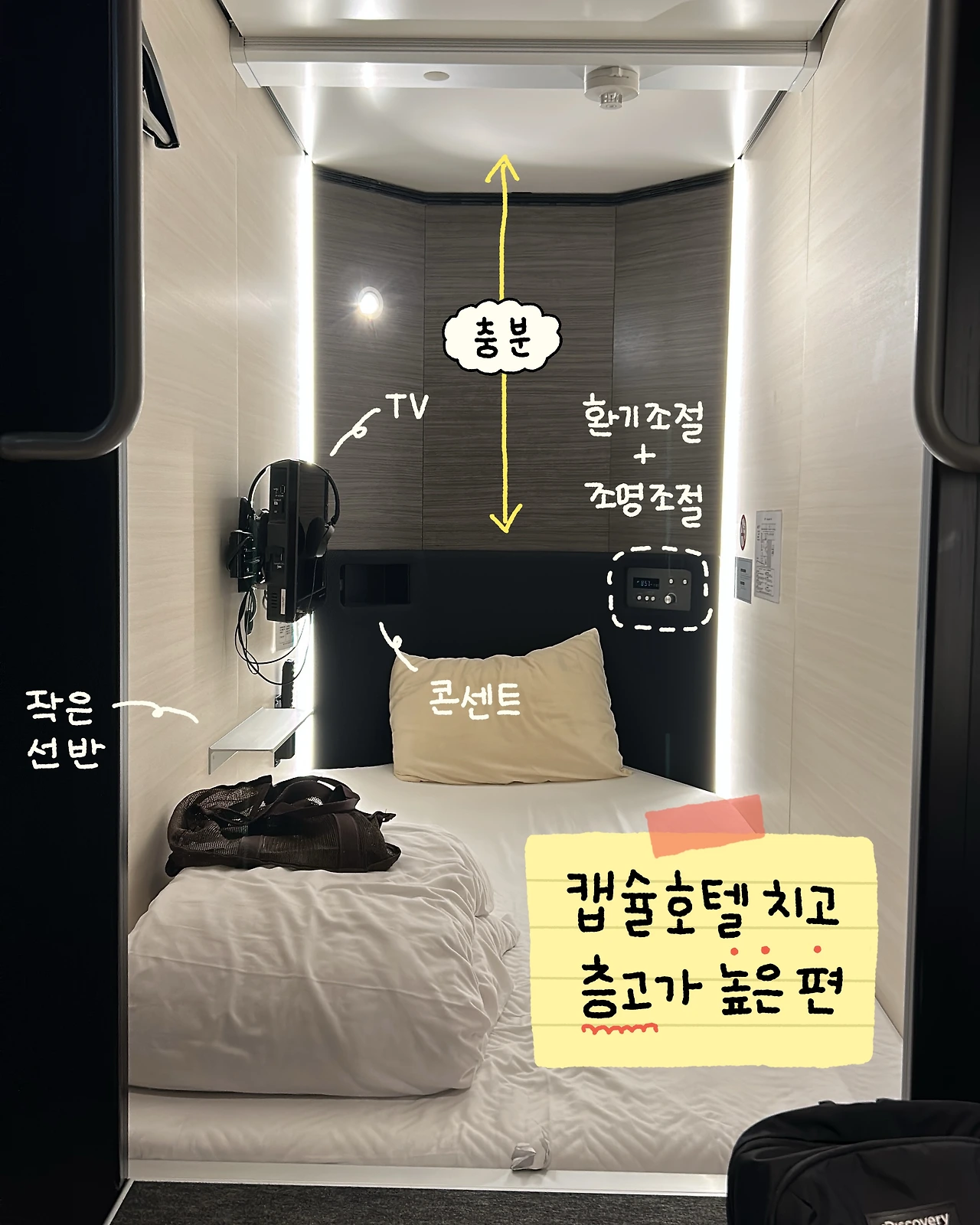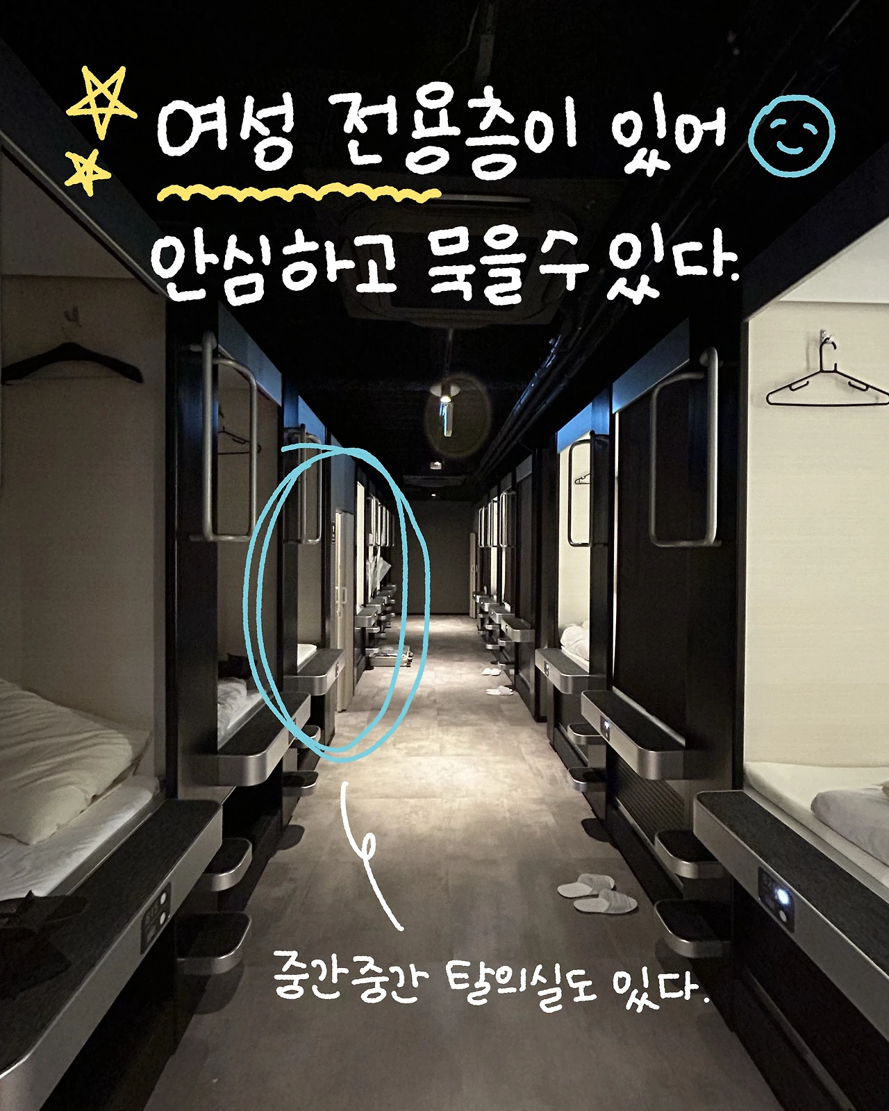 내가 묵은 곳은 깔끔한 캡슐호텔이었다. 천장이 높은 편이라 캡슐호텔 특유의 답답한 느낌이 덜했다. 침대 밑은 짐을 보관할 수 있는 락커가 있었다. 내 26인치 캐리어 살구(살구색이라 살구다. 정겹고 입에 착 붙는다.)는 눕혀서 보관할 수 있었다. 신발장은 따로 없었다. 신발 바구니에 담아 락커에 보관하면 됐다. 깔끔하게 관리되고 있구나 싶어 만족스러웠다.