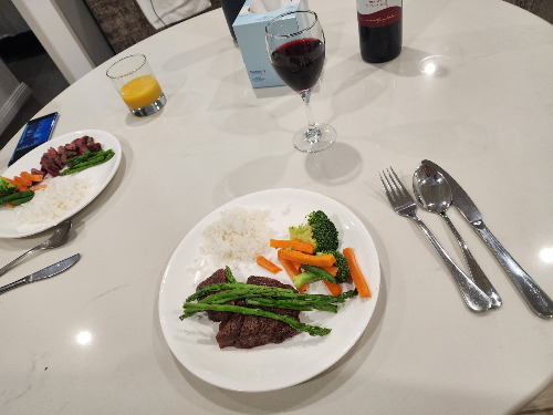 숙소로 돌아오자 허기가 밀려왔다. 인덕션을 켜고 소금과 후추를 뿌린 립아이를 팬에 올린다. 치이익하는 소리와 함께 고소한 냄새가 방 안을 가득 채운다. 익어가는 고기 옆에 아스파라거스를 굽고, 냉동야채를 전자레인지에 데운다. 미디엄 웰던의 스테이크가 완성되고, 하얀 접시에 담긴 스테이크와 와인 한 잔, 오렌지 주스 한 잔이 테이블 위에 올랐다.