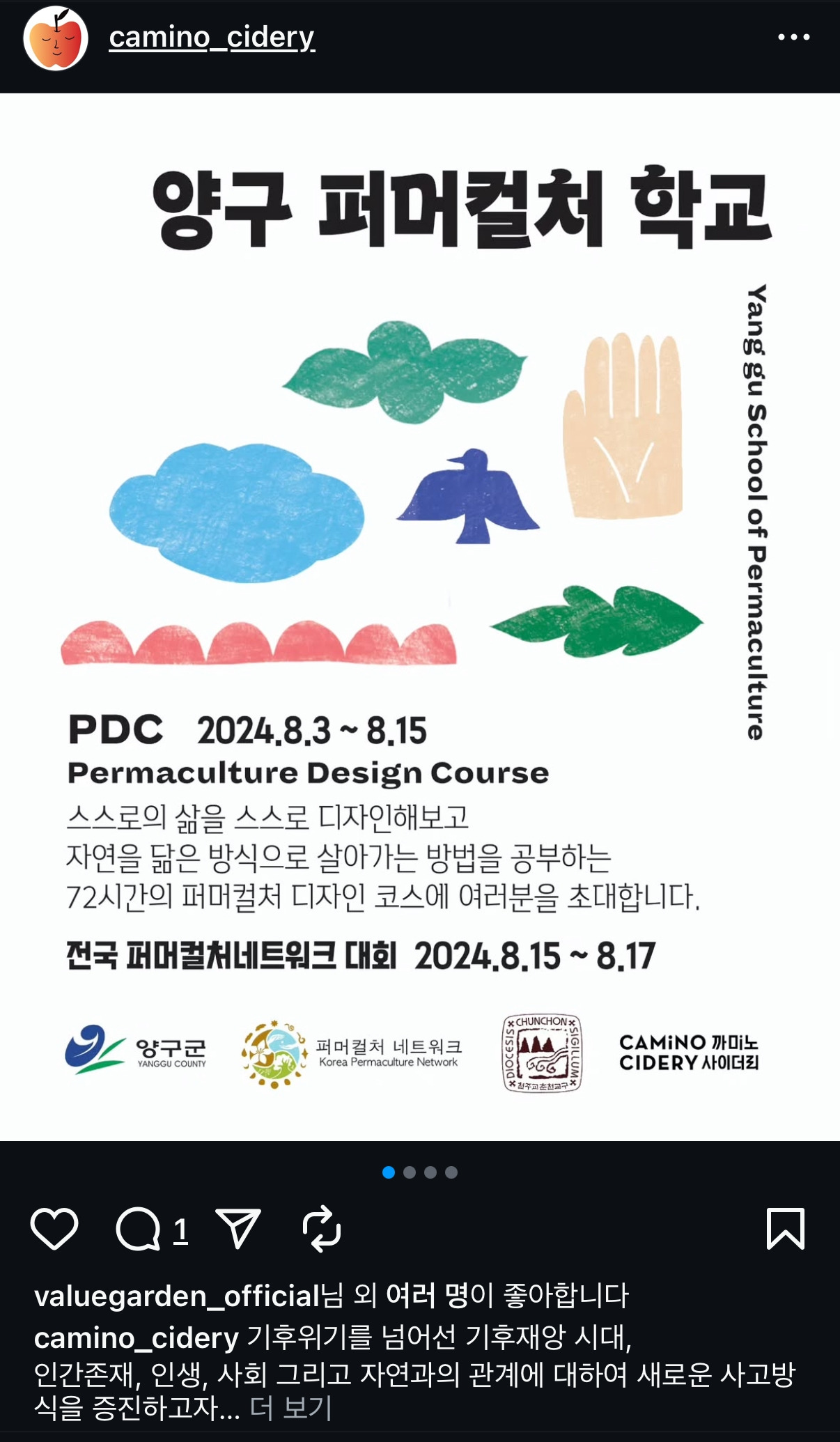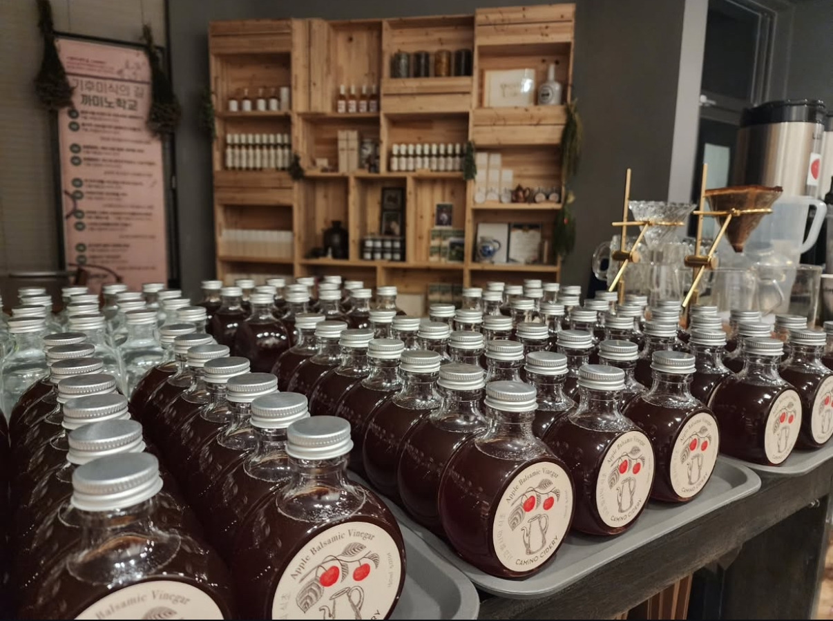 **까미노사이더리 : 지구온난화로 인해 사과 재배 지역이 점점 윗 지역으로 올라오면서, 양구에서도 사과를 재배하고 있다고 한다. 그중에서도 파지 사과를 활용해 애플사이더를 만드는 곳으로, 발사믹펄/블록 등 다양한 형태의 식초를 만날 수 있다. 또한 생산자와 소비자를 있는 플리마켓 '양구 잇(eat)장', 퍼머컬처(지속가능한permanent+농업agriculture)학교 등을 운영하고 있다.