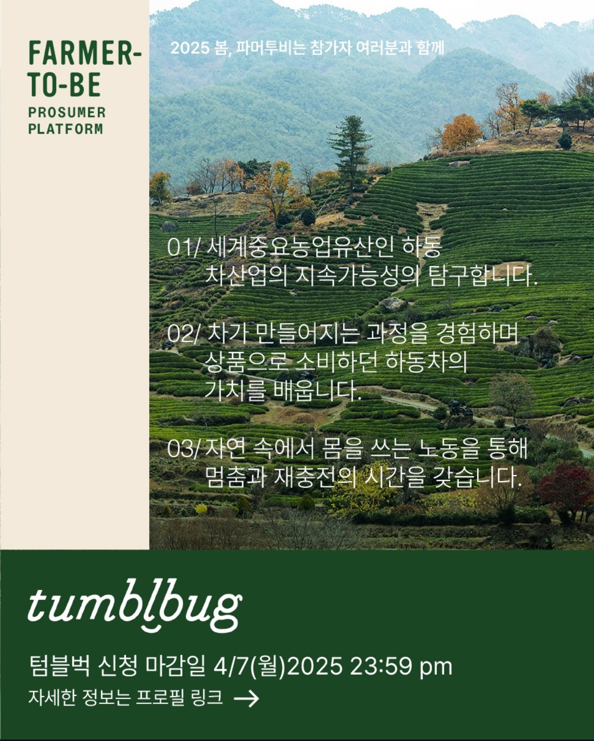 *파머투비 : 안정적인 농업 생산과 지속가능한 소비를 위해 소비자가 직접 참여하는(=프로슈머) 플랫폼을 운영하고 있다. 대표적으로 하동 차밭 지키기 프로젝트가 있으며 찻잎 따기와 차 만들기 클래스 등을 통해 소비자에게는 경험과 지속가능한 농업을 알리고, 지역 농가에는 부족한 인력을 채우는 역할을 하고 있다.