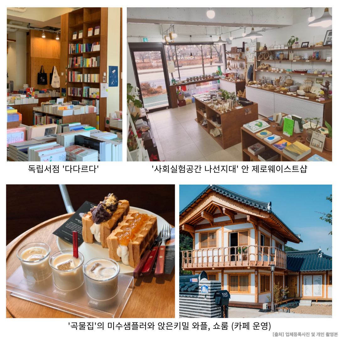 *사회실험공간 나선지대 (대전 유성구) : 자원순환을 고민하는 메이커 스페이스 기업 '재작소'가 운영하는 공간으로 지역 및 사회문제를 해소하기 위한 다양한 사회혁신활동을 기획하고 운영한다. 공간에는 메이커스페이스, 제로웨이스트샵, 생태책방 등이 숍인숍 형태로 있으며 주변에 다른 청년 공간과 가게들이 함께하는 안녕마을에 소재하고 있다.