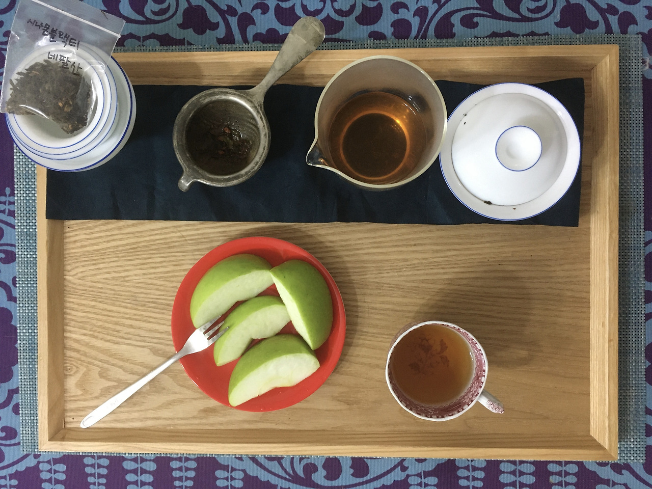 임시공휴일이 지정되어서 일요일 같은 기분입니다. 특히 저는 어제 당직 때문에 출근을 해서 연달아 쉬는 것도 아니에요. 더운 여름날이지만 아침에는 제법 선선한 바람이 불어서 일어나는 기분이 상쾌했습니다. 요즘 개완이라는 뚜껑 달린 잔에 차를 우려마시는 재미에 빠져있는데요. 정성껏 차를 내리고 상큼한 초록 사과를 잘라 예쁜 접시에 담아내니 기분이 좋더라고요. 예전처럼 창밖 경치가 좋았더라면 백배 천배쯤 더 행복했겠지만 지금 이순간도 나쁘지는 않다. 그렇게 생각되었어요.