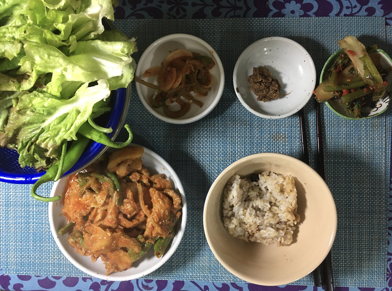 계획대로였다면 오늘 저녁밥은 미역국 한 그릇에 밥을 말아 미역국밥과 부추와 상추 겉저리 또는 오이고추를 된장에 찍어 먹었어야 했다. 집에 운전해 올 때까지만 해도 고추를 된장에 찍어먹을까 고추장에 찍어먹을까만 고민하면서 왔다. 그런데 집에 와서 보니 이미 어제 미역국을 끓이기 전에 다음날의 반찬으로 엄마가 얼려서 보내주신 제육볶음을 해먹으려고 냉장실로 옮겨놨었다는 게 기억났다. 한번 녹인 걸 다시 얼릴 수는 없지, 냉동실에 또 너무 오래 두면 안되겠지. 미역국과 제육볶음을 한 끼에 같이 먹어도 되겠지. 그래서 오늘 저녁은 갑자기 제육볶음으로 변경되었다. 양파와 꽈리고추를 추가로 썰어넣었다. 해놓고 보니 2.5인분 정도 되는 양이다. 깻잎과 상추에 쌈 싸먹고 오이고추도 먹었다. 내일 도시락으로 1인분 싸고, 0.5인분 남은 건 잘게 잘라서 더 작은 통에 담아두었다. 내일 저녁에 볶음밥으로 해먹어야겠다. 이로써 내일 세 끼 메뉴가 다 정해졌다.