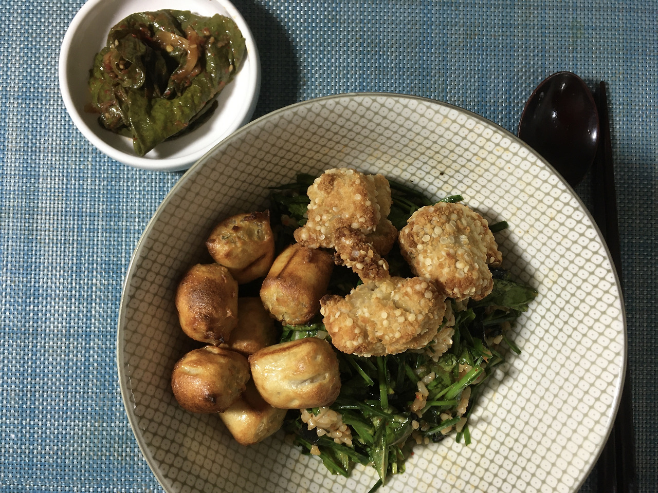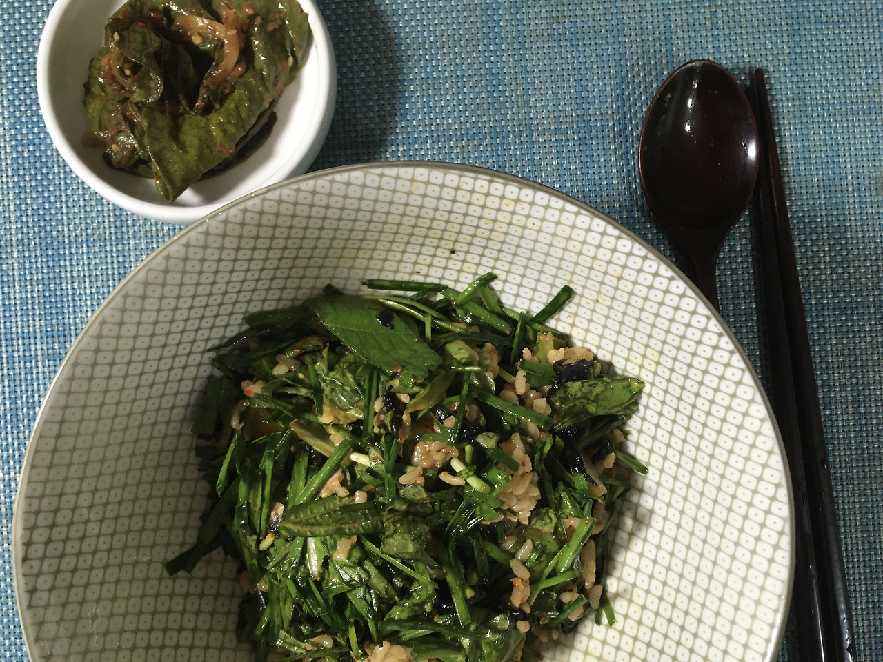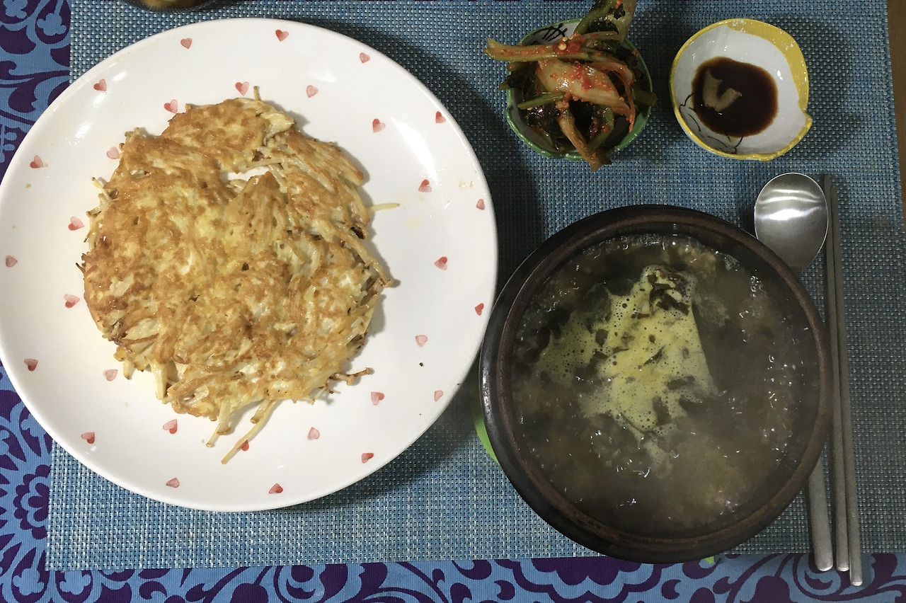 집에서는 미역국에 밥을 말아서 끓인 미역국밥이나 제육볶음에 밥을 볶아 먹었다. 부추와 상추를 잔뜩 썰어서 고추장에 비빈 비빔밥을 나는 추추비빔밥이라고 부른다. 밥은 잘 보이지 않을 정도로 추추들을 많이 넣어줘야 한다. 물론 그것만 먹어도 맛있지만 모름지기 약간의 기름기가 들어가야 제대로된 식사가 끝났다고 위장이 느끼는지 뭔가를 더 곁들여야 한다. 팽이버섯에 달걀을 묻혀 팽이버섯전을 굽거나, 냉동식품을 추추비빔밥에 토핑으로 올린다.