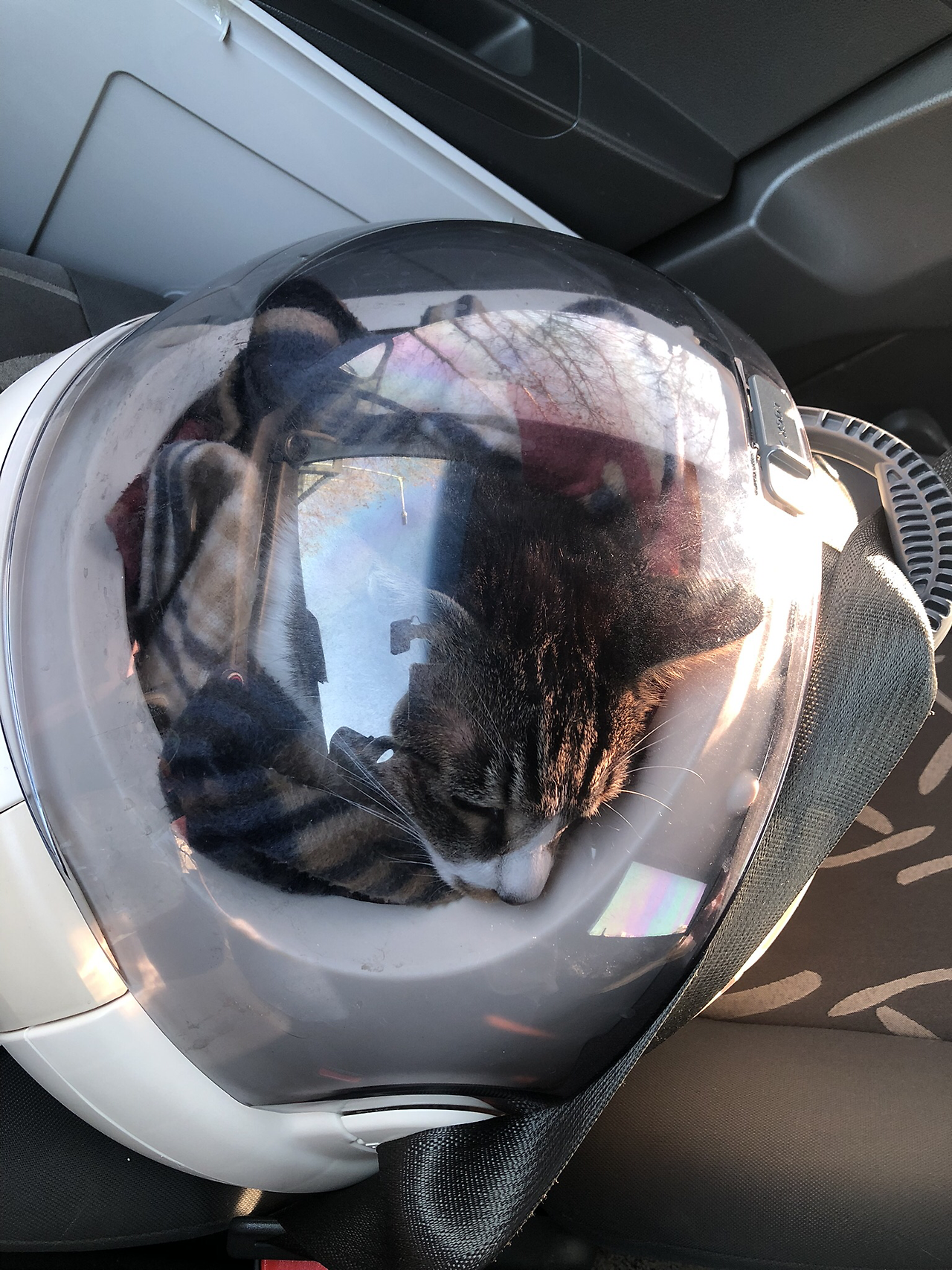 가지의 이동장은 반구 형태로 된 우주선 모양인데 보조석에 놓고 손잡이 부분을 벨트로 고정한다. 인간이 여기 있어. 걱정하지마. 안전하게 강릉까지 가보자. 쉬엄쉬엄 갈 거야, 가다가 가지 힘들면 휴게소에 들를 거야. 나를 위한 다짐, 가지를 위한 애원과 설득, 알아듣길 바라면서 계속 말하고 또 말하다가 가지가 너무 울어서 조금만 열어 손으로 쓰다듬어주고 싶어졌다. 그런데 역시! 그 사이에 가지가 이동장 밖으로 튀어 나와 조수석 아래쪽으로 깊숙히 들어갔다. 안전벨트가 채워진 채로 이동장의 문을 열다가 벨트가 이동장 문 사이에 끼는 바람에 잠깐 우왕좌왕 벨트를 정리하는 사이 가지가 탈출했다. 가지를 다시 잡아서 이동장에 넣어야 하는데… 내가 손을 대려고 하면 너무너무 화를 낸다. 내가 모른척 가만히 운전석에 앉아있으니 가지도 얌전히 자리잡고 앉아 있었다.