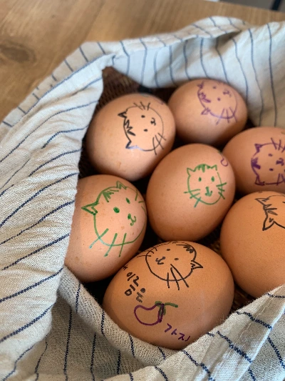 도착해서 짐을 풀자마자 준비한 찐 달걀에 네임펜으로 가지 얼굴을 그렸다. 든든히 밥도 먹고 갔는데 초조해서인지 은덕이 점심식사 할 때 얻어먹었다. (그냥 먹고 싶어서겠지!)