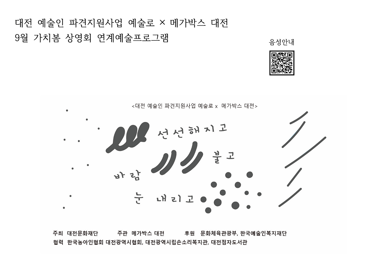 드디어, 9월 25일 화요일의 가치봄 영화상영회 날이 되었다. 전시작품에 점자를 포함시키기로 하면서 뒤늦게 시각을 보완할 장치를 생각했다. 부족하지만 행사 홍보문과 안내문을 녹음해서 큐알코드로 연결되게 했다.