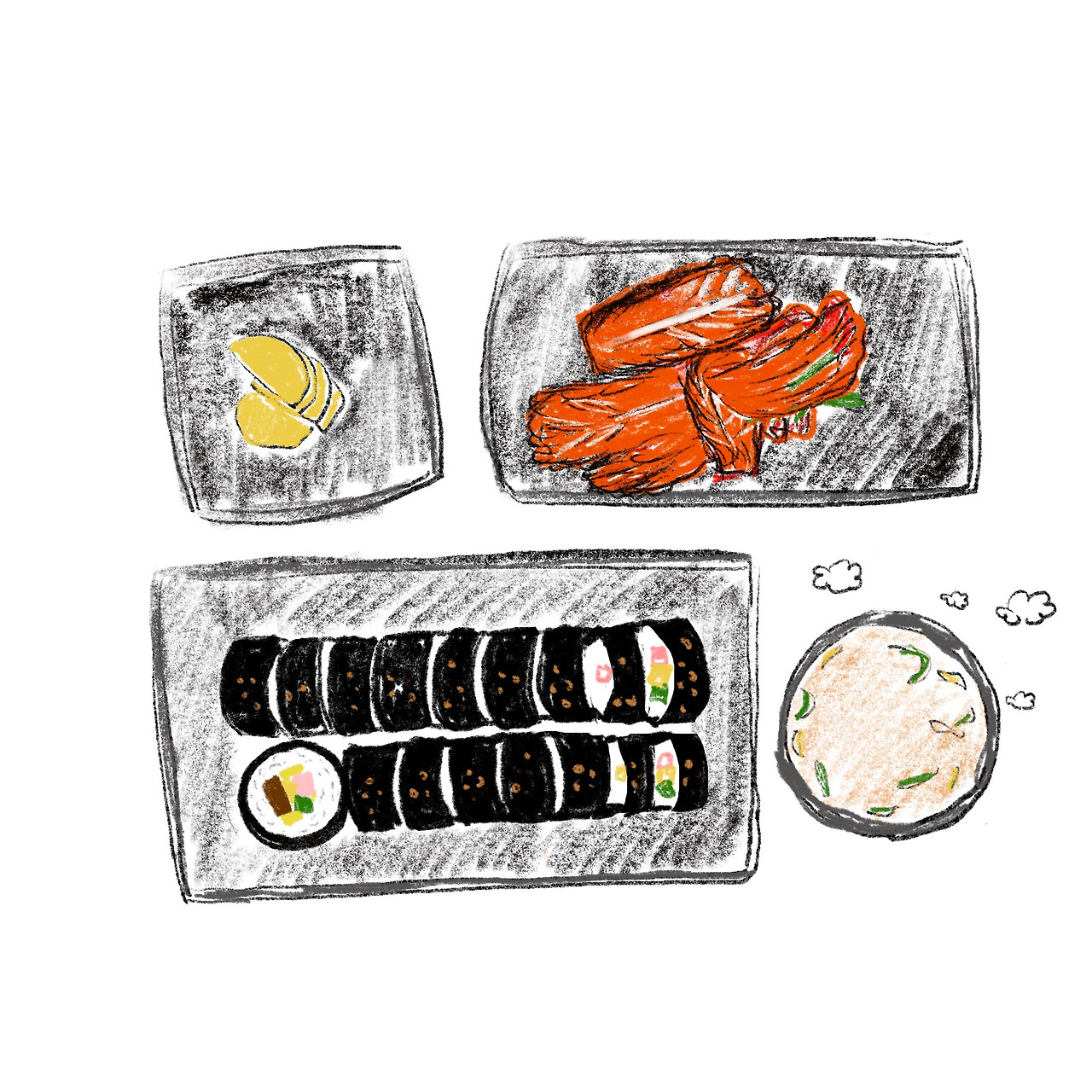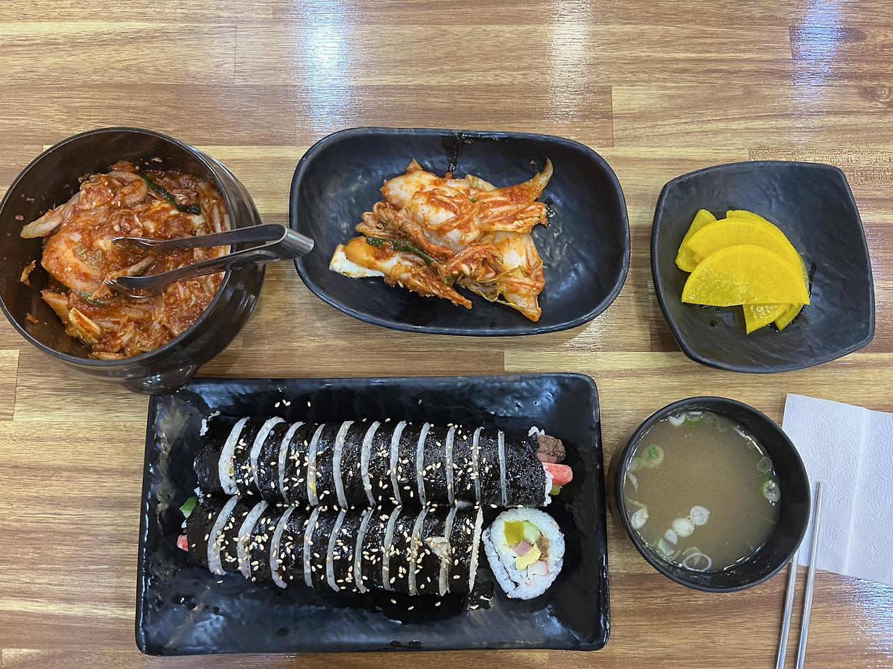 김밥을 시키면 단무지와 김치, 국물이 바로 나온다. 손님이 매우 많고 회전이 빠른 식당에서 나이가 제법 든 직원이 능숙하게 음식을 내주는 곳을 좋아한다. 감탄하며 홀의 직원들이 움직이는 모습을 구경하다보면 통통한 김밥 두 줄이 나온다. 2023년 12월 기준으로 두 줄에 6천원. 햄, 오이, 단무지, 맛살, 달걀, 간장에 졸인 유부가 들어 있다. 약간 짠데, 맛있다. 아삭아삭한 겉절이 배추김치를 곁들여서 먹는다.